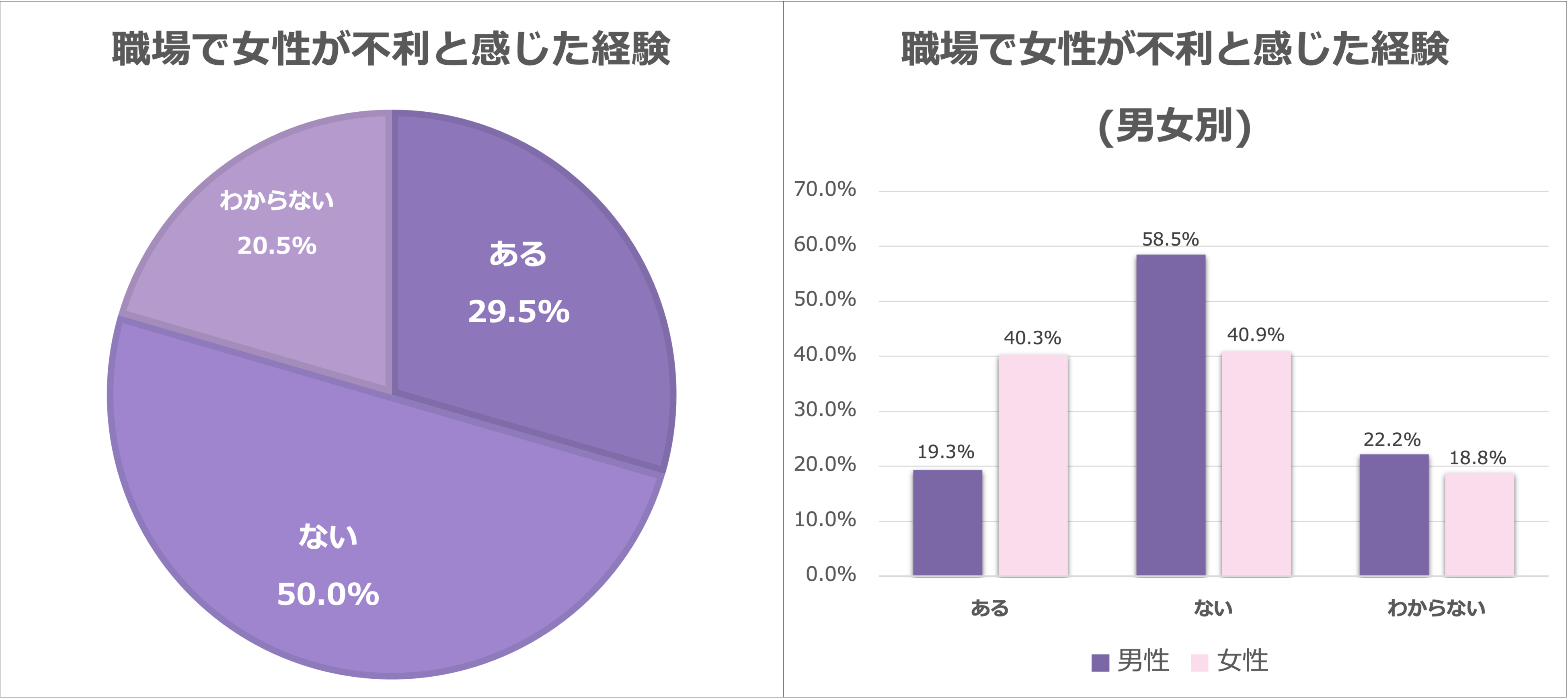 現在の職場において、女性が不利だと感じた経験について、全体では29.5%が「ある」と回答し、50.0%が「ない」と回答しました。これを男女別で見ると、「ある」と回答した男性は19.3%で、女性は40.0%と2倍以上の差が出る結果になりました。