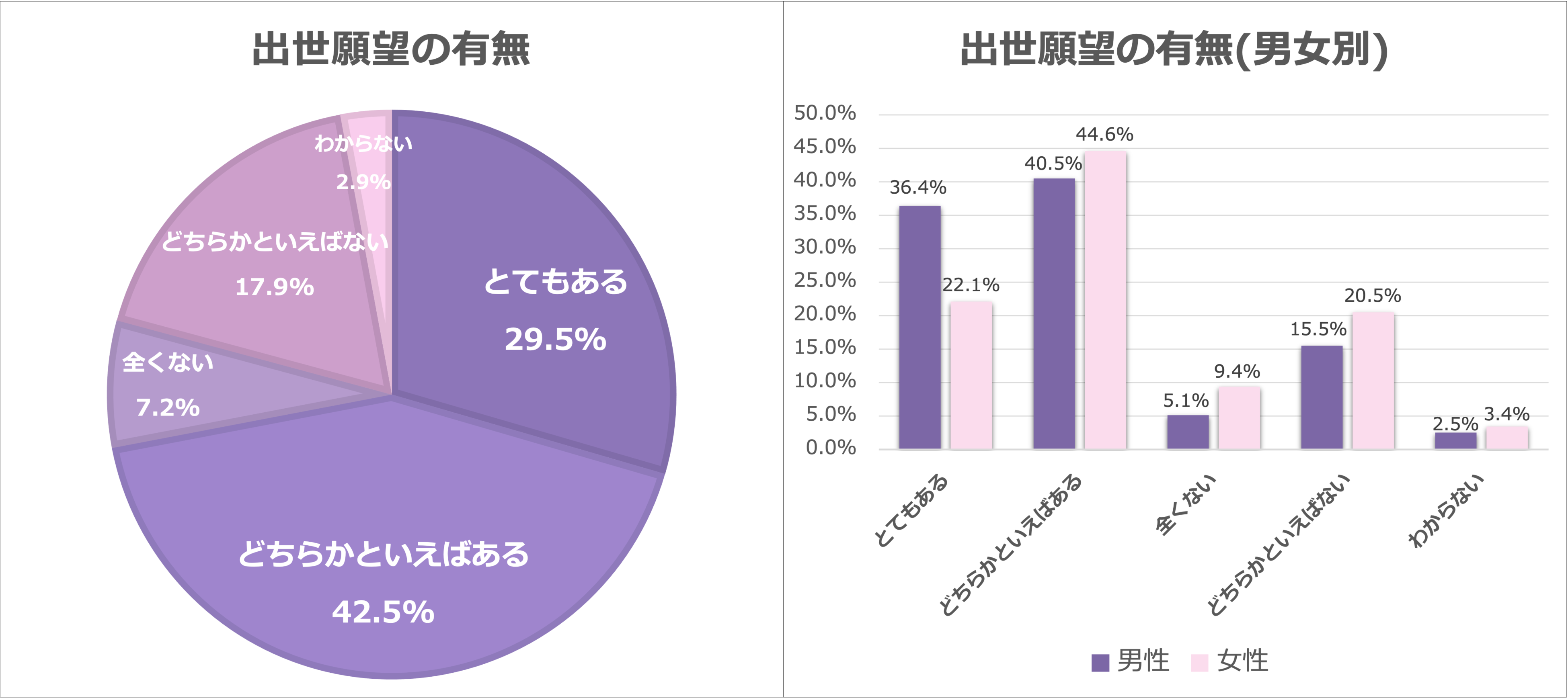 出世願望の有無については、全体の29.5%が「とてもある」で、42.5%が「どちらかといえばある」と回答し、合算した72.0%が出世願望ありの回答をしました。こちらも男女別では差が見られ、男性回答では「とてもある」が36.4%に対して女性は22.1%になりました。また「全くない」「どちらかといえばない」の合算でも、”ない派”の女性回答が約10%男性回答よりも上回る結果になりました。