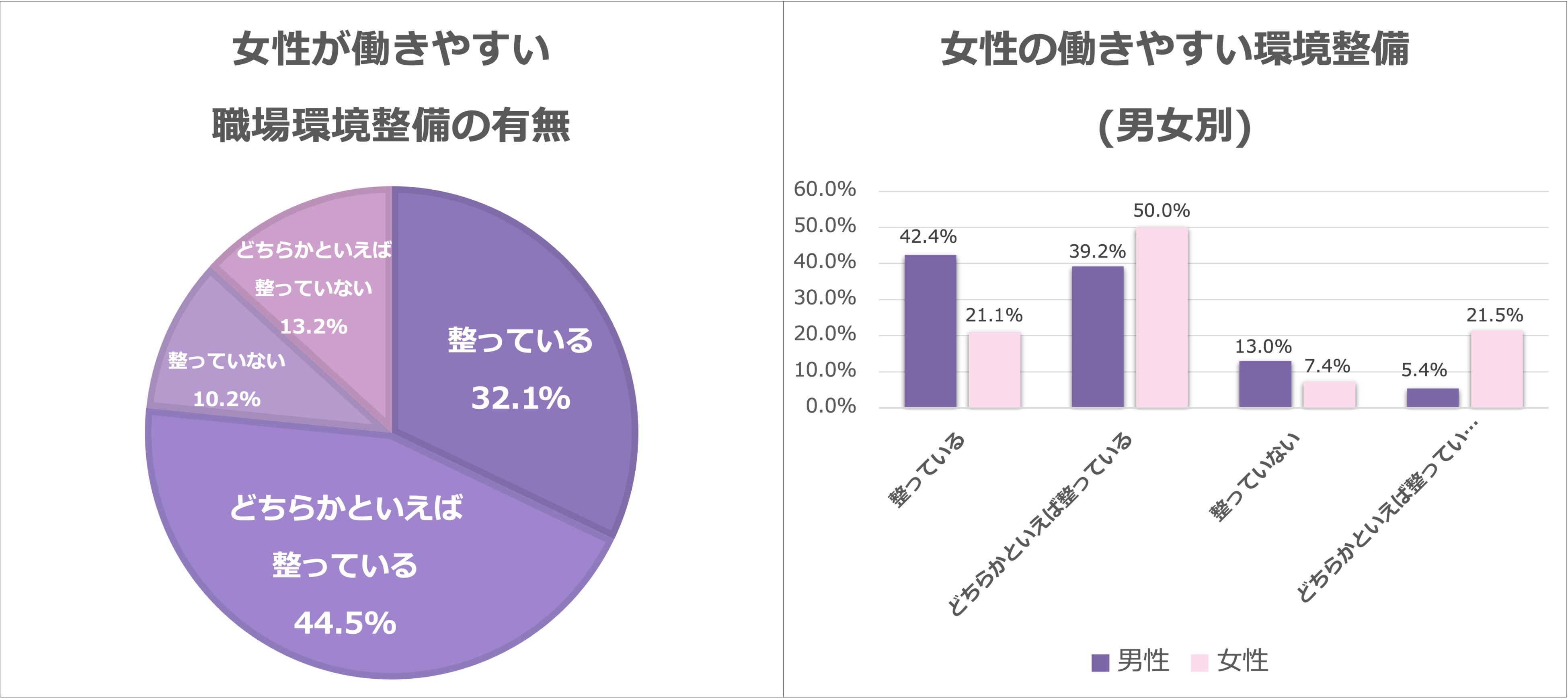 現在の職場で女性が働きやすい環境が整備されているかについて、全体の32.1%が「整っている」と回答し、「どちらかといえば整っている」が44.5%で、合算した76.6%が整備されている派の回答結果になりました。また、男女別で見ると認識の差が見られ、男性は「整っている」42.2%に対し、女性の認識はその半数の21.1%でした。「どちらかといえば整っている」を合算した整備されている派の男女別回答では、どちらも7割超える回答結果になりました。