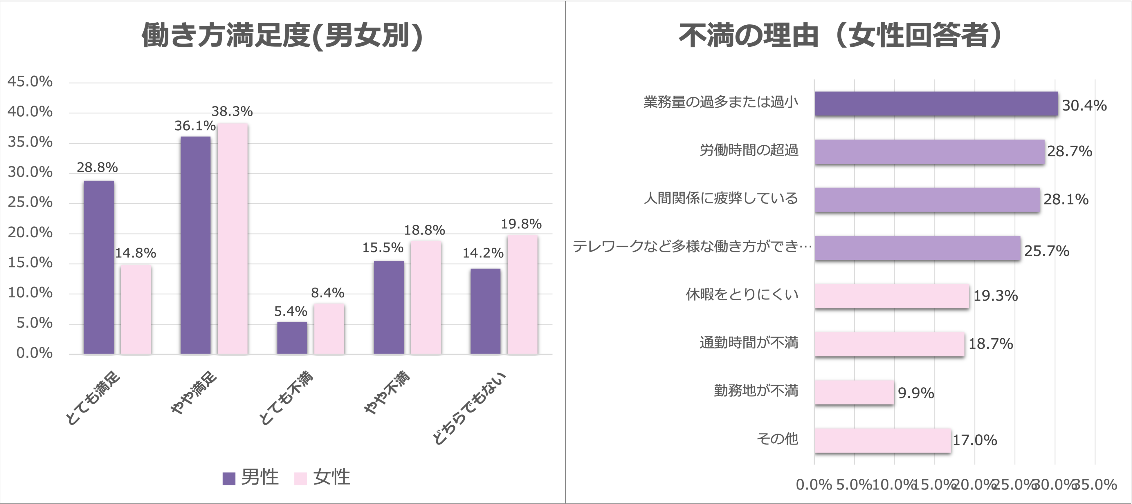 女性回答者の不満の理由については、「業務量の過多または過小」が30.4%と最多で、次いで「労働時間の超過」28.7%、「人間関係に疲弊している」28.1%が上位3つと回答結果となりました。