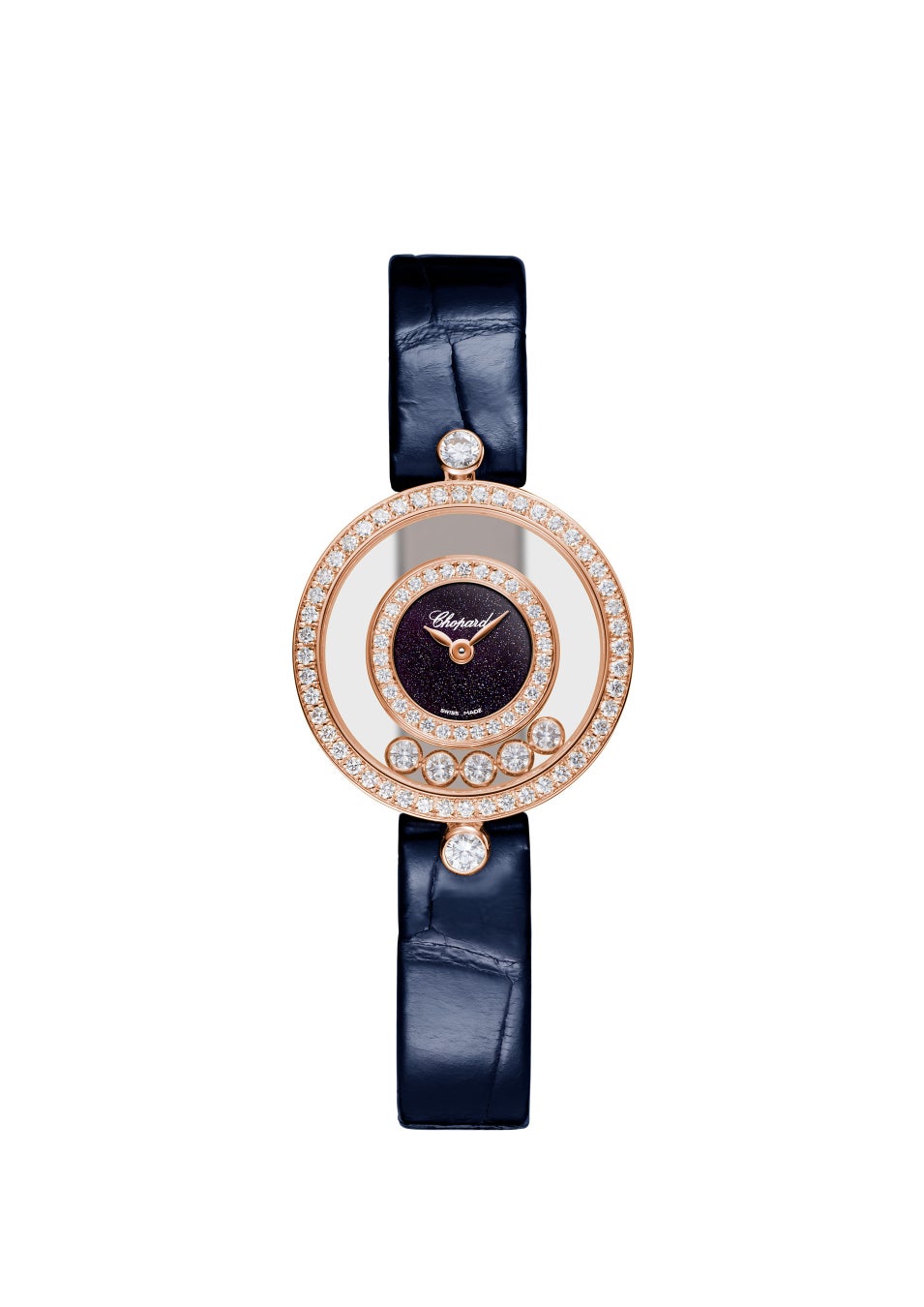 丸みを帯びたフェミニンなフォルムを描く26mm径の「ハッピーダイヤモンド」ウォッチ。そのユニークでアイコニックなデザインは、時分針を備えた中央のケースを、ダイヤモンドをあしらった18Kエシカルローズゴールド製のセコンドベゼルが取り囲みます。間に配された2枚のサファイアクリスタルの間では、5つのムービングダイヤモンドが揺れ動き、12時と6時位置にあしらわれたダイヤモンドに共鳴します。そして、アトリエの頭脳の結晶ともいえる、ケース裏面の時刻調整のためのプッシュボタン。ケースサイドのリューズを取り払うことで、ウォッチが描く完璧な円を維持しつつ、軽やかな仕上がりとなっています。永遠に続く歓喜に満ちたダンスの舞台で、「ハッピーダイヤモンド」が魅せる華麗なステップは、ムービングダイヤモンドが誕生して以来、ショパールが演出し続けてきたコレオグラフィーなのです。