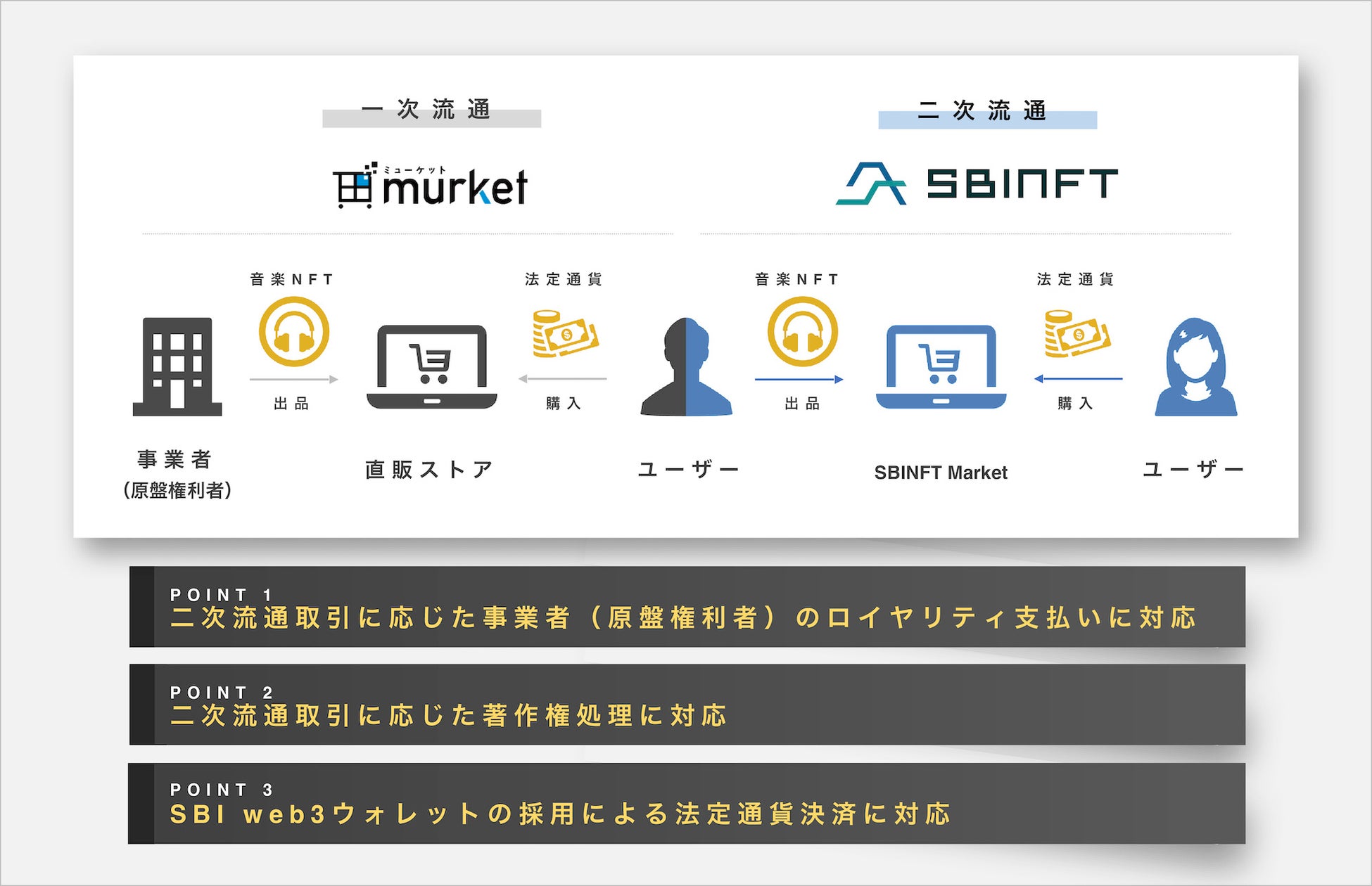 今般、「murket」で販売する音楽NFTのうち、権利者が希望した音楽NFTは、著作権使用料の支払いを前提に、審査承認済みのアーティストが作るNFTだけを取り扱うパブリックチェーン型NFTマーケットプレイス「SBINFT Market」内の「murket Second Market」上で、ユーザーが売買できるようになります。