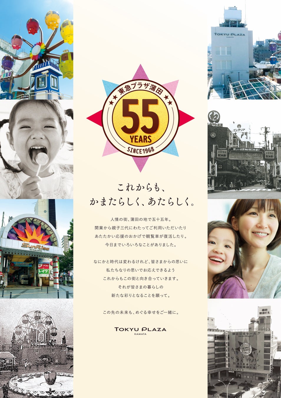 当館は、1968年11月に「蒲田東急ビル」として開業して以来、半世紀以上にわたり蒲田の街の賑わいに貢献すべく営業し、地域の人たちに親しまれてきました。これまでの55年間のお客様からの応援やご愛顧に感謝するとともに、これからも蒲田の街や人と向き合い続けていく私たちの思いをキービジュアルに込めました。