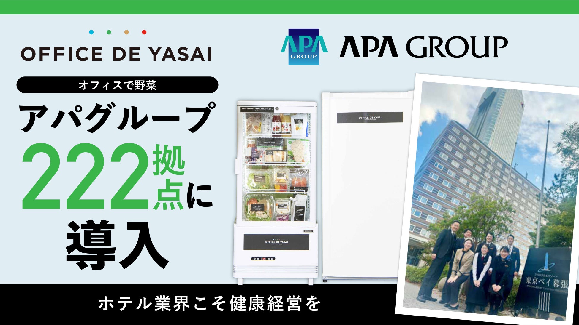 アパグループは、従業員に対する福利厚生制度の一環として、この度OFFICE DE YASAI「オフィスでごはん」プランをグループ内の全ホテルおよびその他全拠点、合わせて200を超える拠点に導入することとなりました。