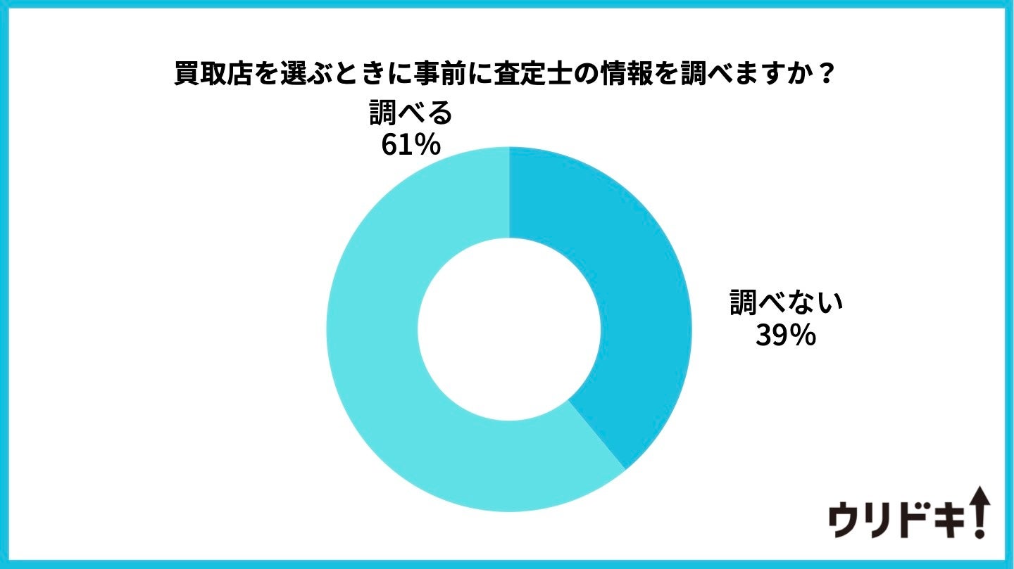 「買取店を利用するときに事前に査定士を調べるか」について、「調べる」の意見が多い結果となりました。