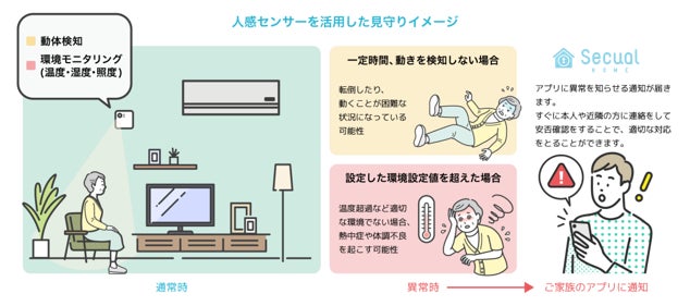 Secualは人の動きだけでなく温度・照度・湿度を測定することが可能な人感センサーを提供しています。通常は侵入犯を検知する防犯対策として利用していますが、高齢者の熱中症対策にも応用可能です。