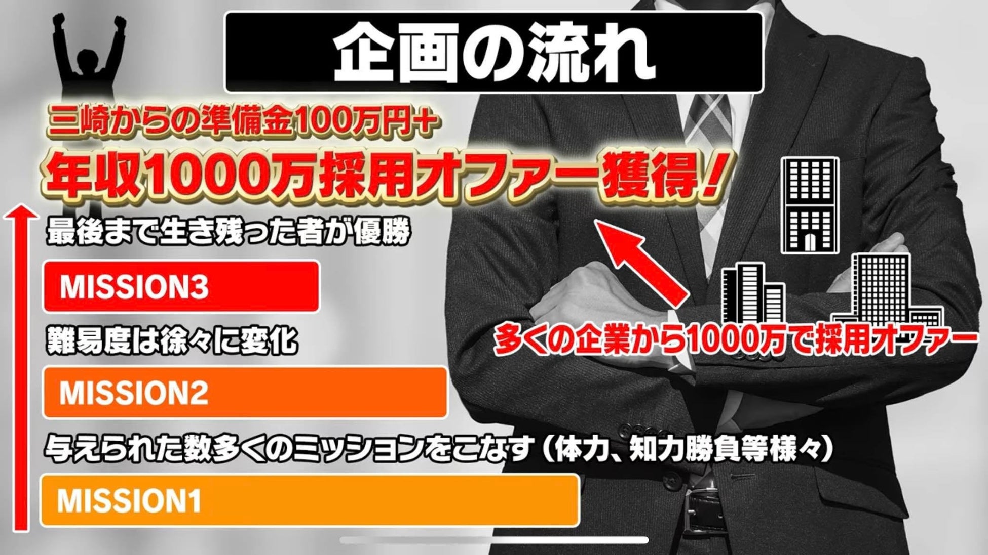 本企画では現在の就活事情にメスをいれ、新時代のスターサラリーマンを発掘する企画です。優勝者には三崎優太が100万の就活準備金をプレゼント。さらに少なくとも1人の優勝者は最大1,000万の年収オファーをゲットできます。尚、場合によっては、1,000万オファーが乱発される可能性も充分ございます。