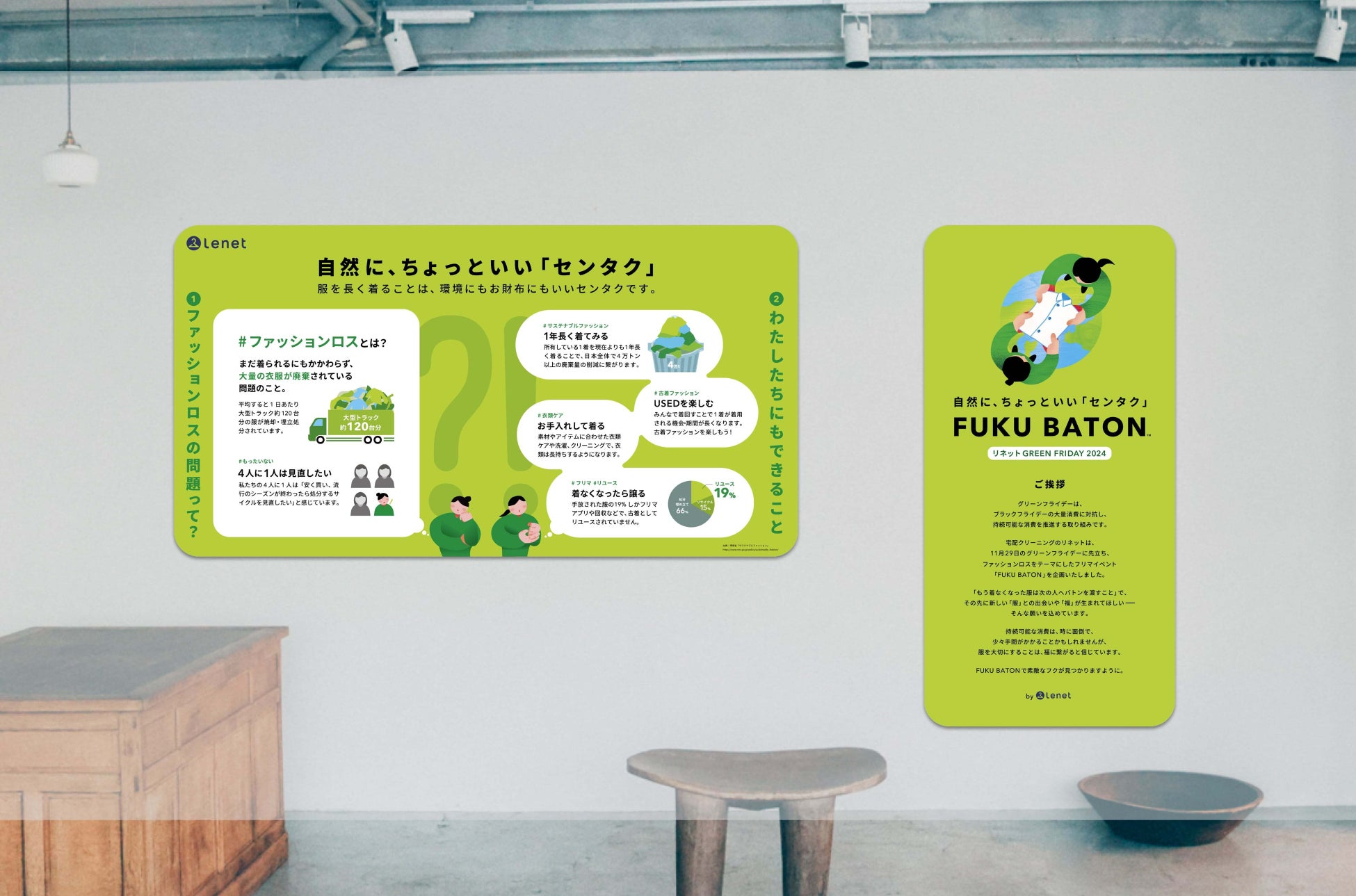 そこで、リネットではグリーンフライデーをきっかけに、「『もう着なくなった服を捨てずに、次の方へ服を手渡すこと』もサステナブルなアクションのひとつであることを知っていただきたい、そしてその先に服や福との出会いが生まれてほしい。」という願いを込めて、次の人へ服のバトンを渡すフリーマーケット「FUKU BATON(フク バトン)」を企画しました。