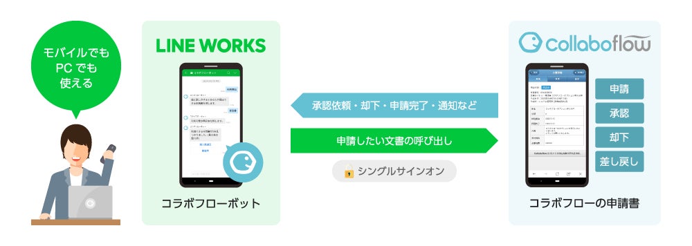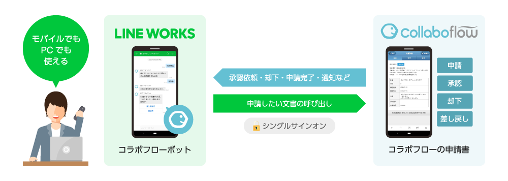 LINE WORKSから直接コラボフローの申請書にアクセスできます。PCでもスマホでも、コラボフロー上の申請書の検索・表示、判定依頼通知の受け取りが可能です。シングルサインオンに対応しているので、二重ログインの手間もありません。