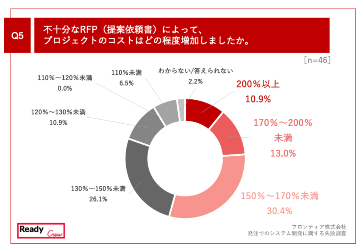 Q2で「RFP(提案依頼書)」と回答した方に、「Q5.不十分なRFP(提案依頼書)によって、プロジェクトのコストはどの程度増加しましたか。」(n=46)と質問したところ、「150%~170%未満」が30.4%、「130%〜150%未満」が26.1%という回答となりました。
