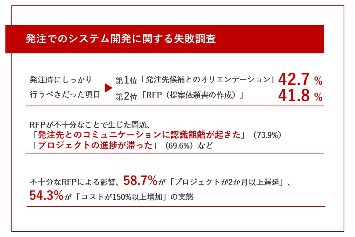 システム開発プロジェクトの当初の目的については、6割以上が「顧客の利便性・満足度の向上」「社内業務の自動化・効率化」と回答しています。そして、システム発注時に「これだけはしっかり行うべきだった」と後悔した項目、第1位は「発注先候補とのオリエンテーション」(42.7%)、第2位は「RFP(提案依頼書の作成)」(41.8%)という結果になりました。