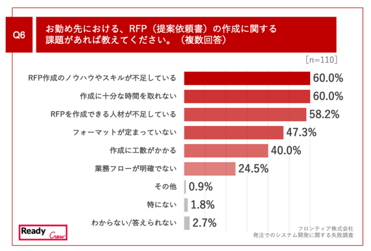 「Q6.お勤め先における、RFP(提案依頼書)の作成に関する課題があれば教えてください。(複数回答)」(n=110)と質問したところ、「RFP作成のノウハウやスキルが不足している」が60.0%、「作成に十分な時間を取れない」が60.0%、「RFPを作成できる人材が不足している」が58.2%という回答となりました。