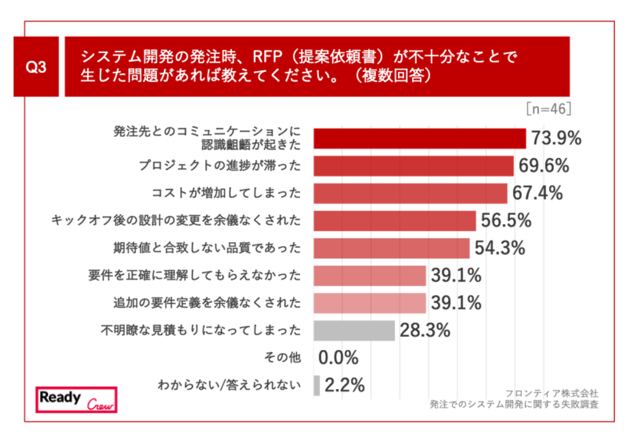 Q2で「RFP(提案依頼書)」と回答した方に、「Q3.システム開発の発注時、RFP(提案依頼書)が不十分なことで生じた問題があれば教えてください。(複数回答)」(n=46)と質問したところ、「発注先とのコミュニケーションに認識齟齬が起きた」が73.9%、「プロジェクトの進捗が滞った」が69.6%、「コストが増加してしまった」が67.4%という回答となりました。