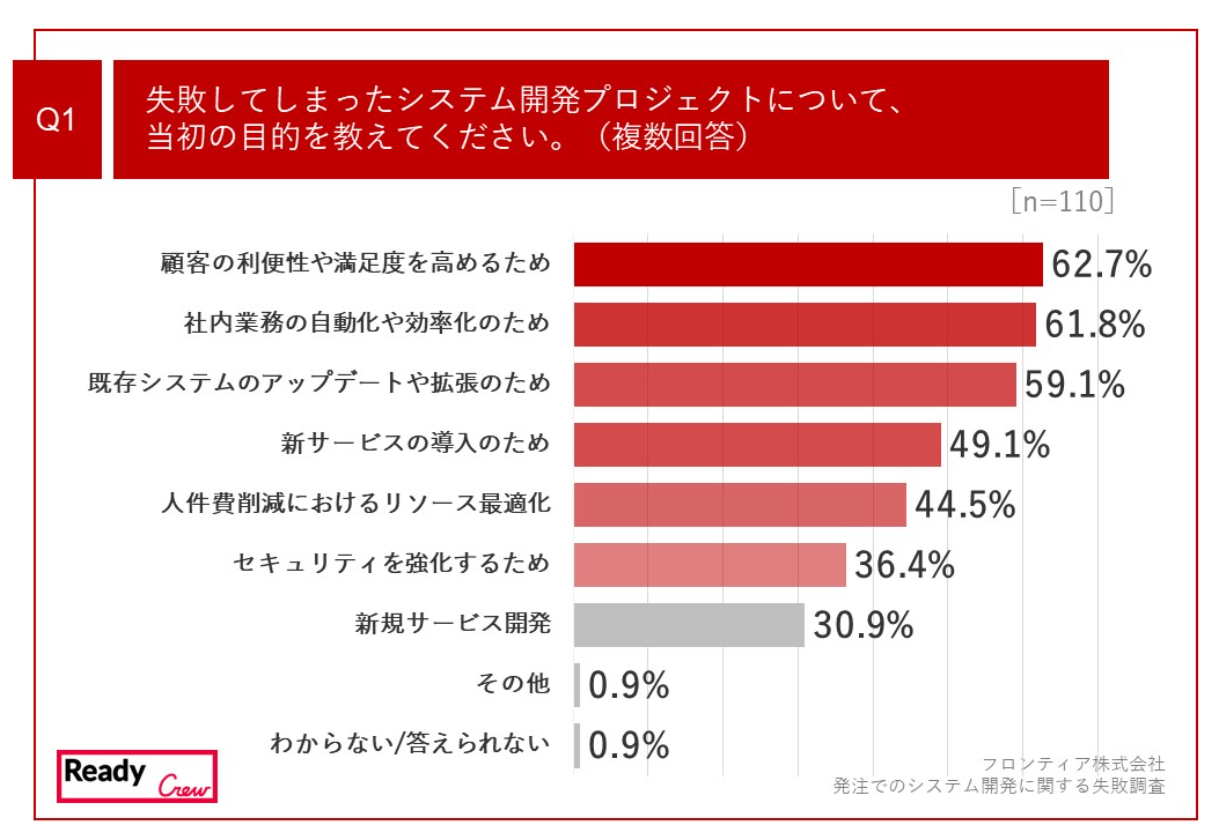 「Q1.失敗してしまったシステム開発プロジェクトについて、当初の目的を教えてください。(複数回答)」(n=110)と質問したところ、「顧客の利便性や満足度を高めるため」が62.7%、「社内業務の自動化や効率化のため」が61.8%、「既存システムのアップデートや拡張のため」が59.1%という回答となりました。
