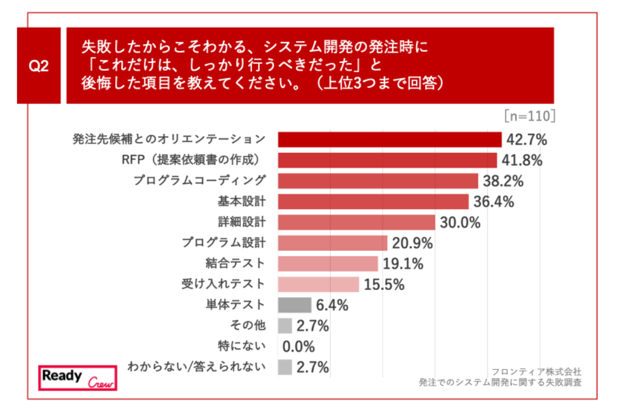 「Q2.失敗したからこそわかる、システム開発の発注時に「これだけは、しっかり行うべきだった」と後悔した項目を教えてください。(上位3つまで回答)」(n=110)と質問したところ、「発注先候補とのオリエンテーション」が42.7%、「RFP(提案依頼書の作成)」が41.8%、「プログラムコーディング」が38.2%という回答となりました。