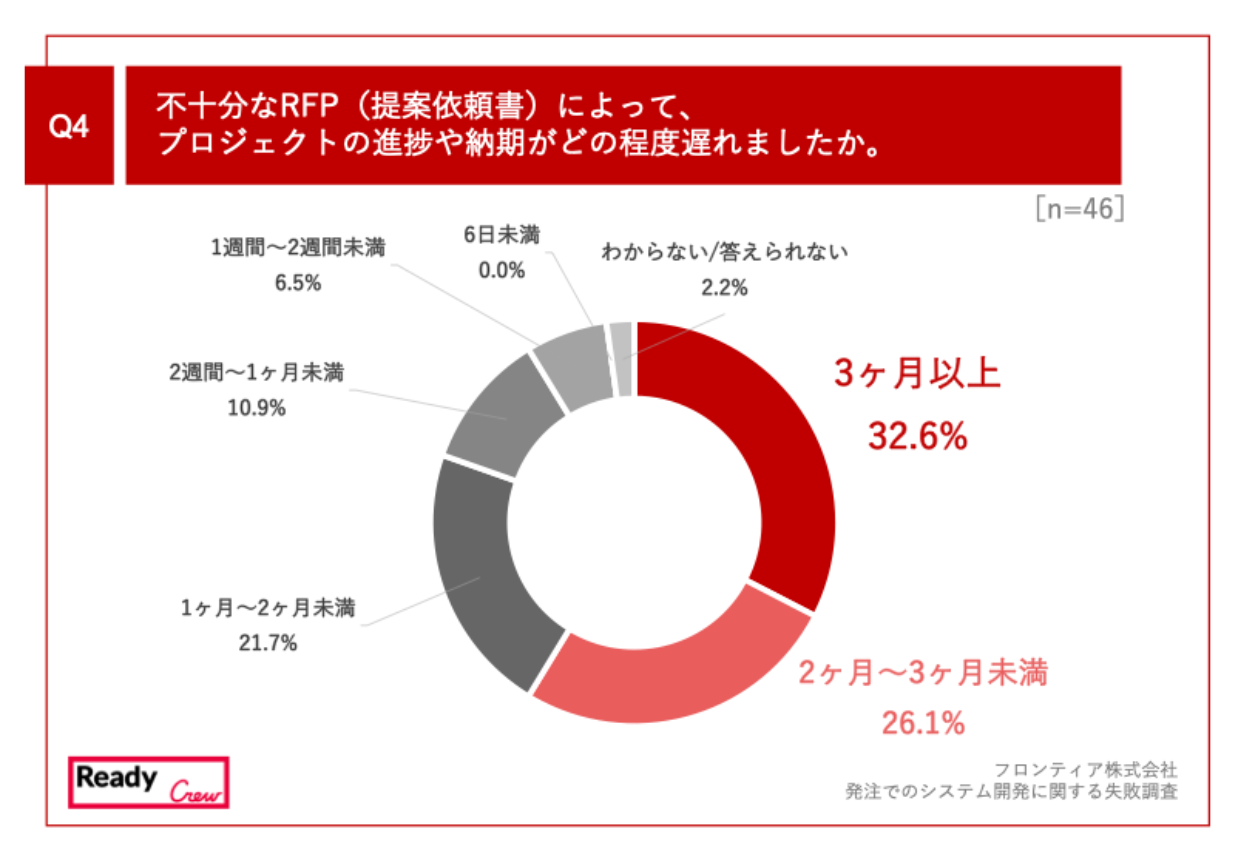 Q2で「RFP(提案依頼書)」と回答した方に、「Q4.不十分なRFP(提案依頼書)によって、プロジェクトの進捗や納期がどの程度遅れましたか。」(n=46)と質問したところ、「3ヶ月以上」が32.6%、「2ヶ月~3ヶ月未満」が26.1%という回答となりました。
