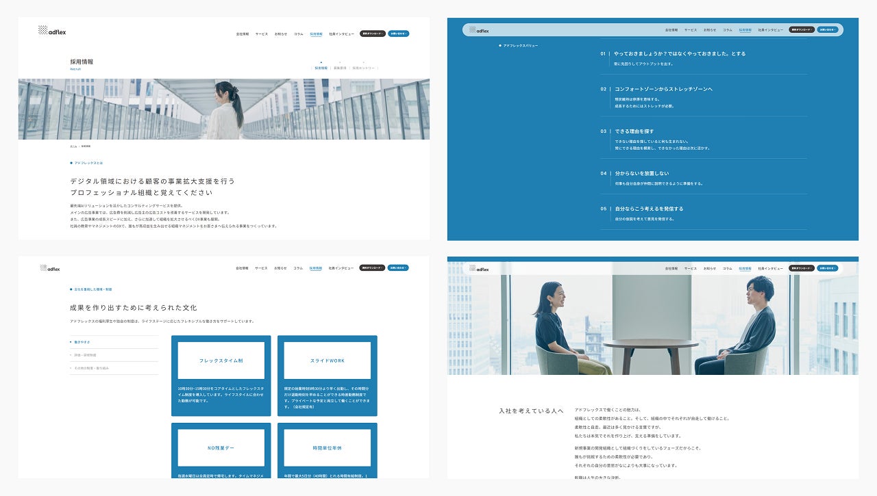 社内で大切にしている価値観「アドフレックスバリュー」を追加。その他、求職者にアドフレックスを十分に知っていただくため、会社紹介動画や制度、社員インタビューなど、多数のコンテンツを掲載しています。