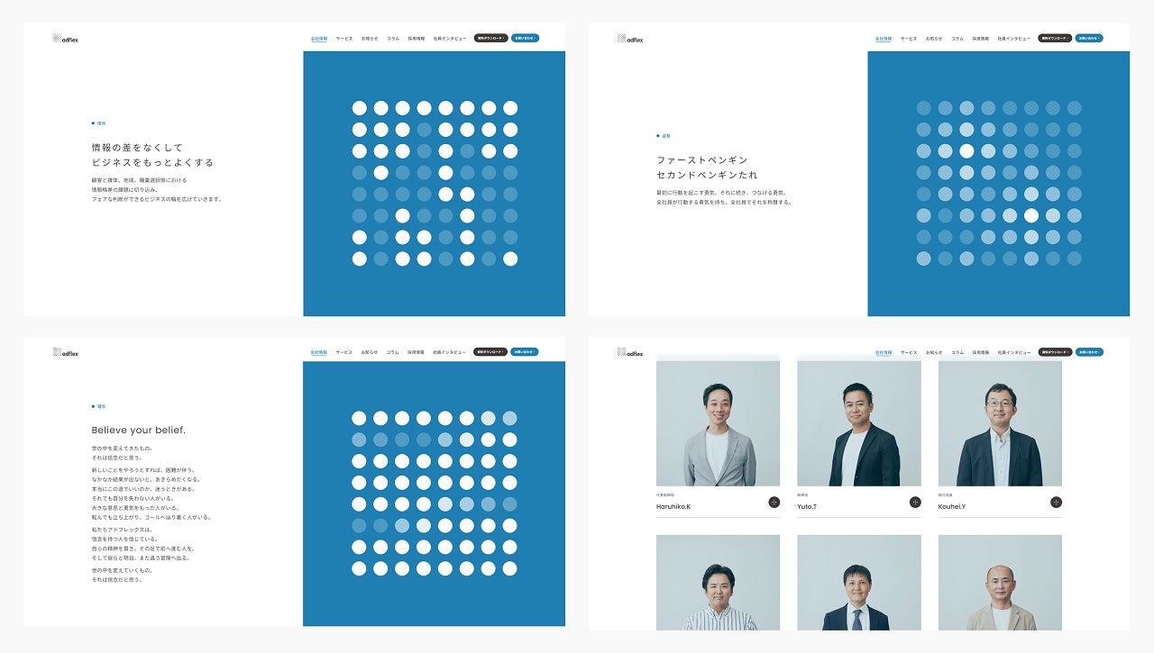 当社の掲げる使命、姿勢、理念を掲載。ドットのモーションと連動しており、それぞれアドフレックスが大切にしている想いを表現しています。