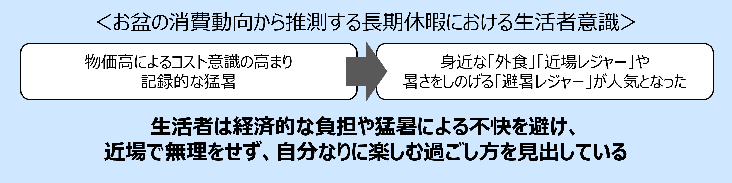 こうした動向から、長期休暇における生活者意識を考察すると、経済的な負担や猛暑による日常生活でのストレスを回避し、近場で“無理をせず、自分なりの楽しみ方を見出している”といえるでしょう。