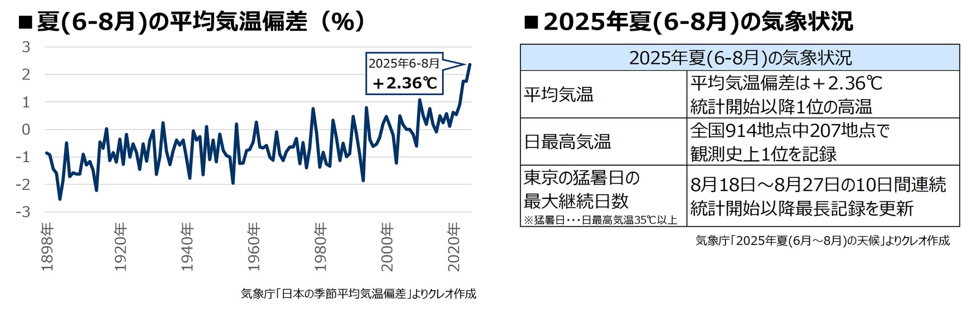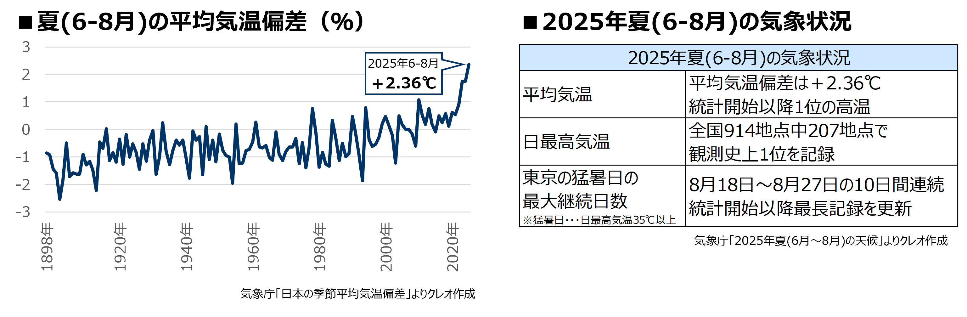 続いて、2025年の夏がどのような環境だったのかを振り返ります。2025年の夏は、平均気温が統計開始以来で最高となり、記録的な猛暑となりました。また、日最高気温は207地点で観測史上最高を記録したほか、東京では猛暑日の継続日数が過去最長を更新し、最も暑い夏となりました。