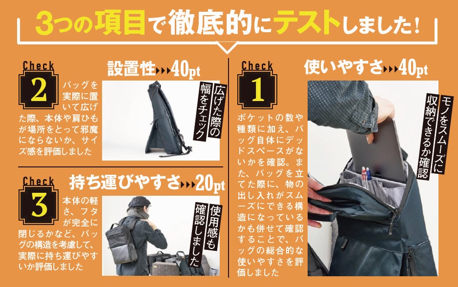 注目すべきはコンパクトなボディ。さまざまな収納も備え、無駄のない使いやすさを実現していました。本体が薄くて奥行きをとらない割に、丈夫なフレームを内蔵していて、どこでも立てられるので、設置性も高評価。持ち運びやすさは本体の留め具がファスナー式のバッグと比べて密閉性は高くはないものの、軽さが魅力的。近場のカフェで作業したい人や、ちょっとした移動で荷物を持ち運びたい人も、これさえ使えば作業が捗ること間違いなしです。