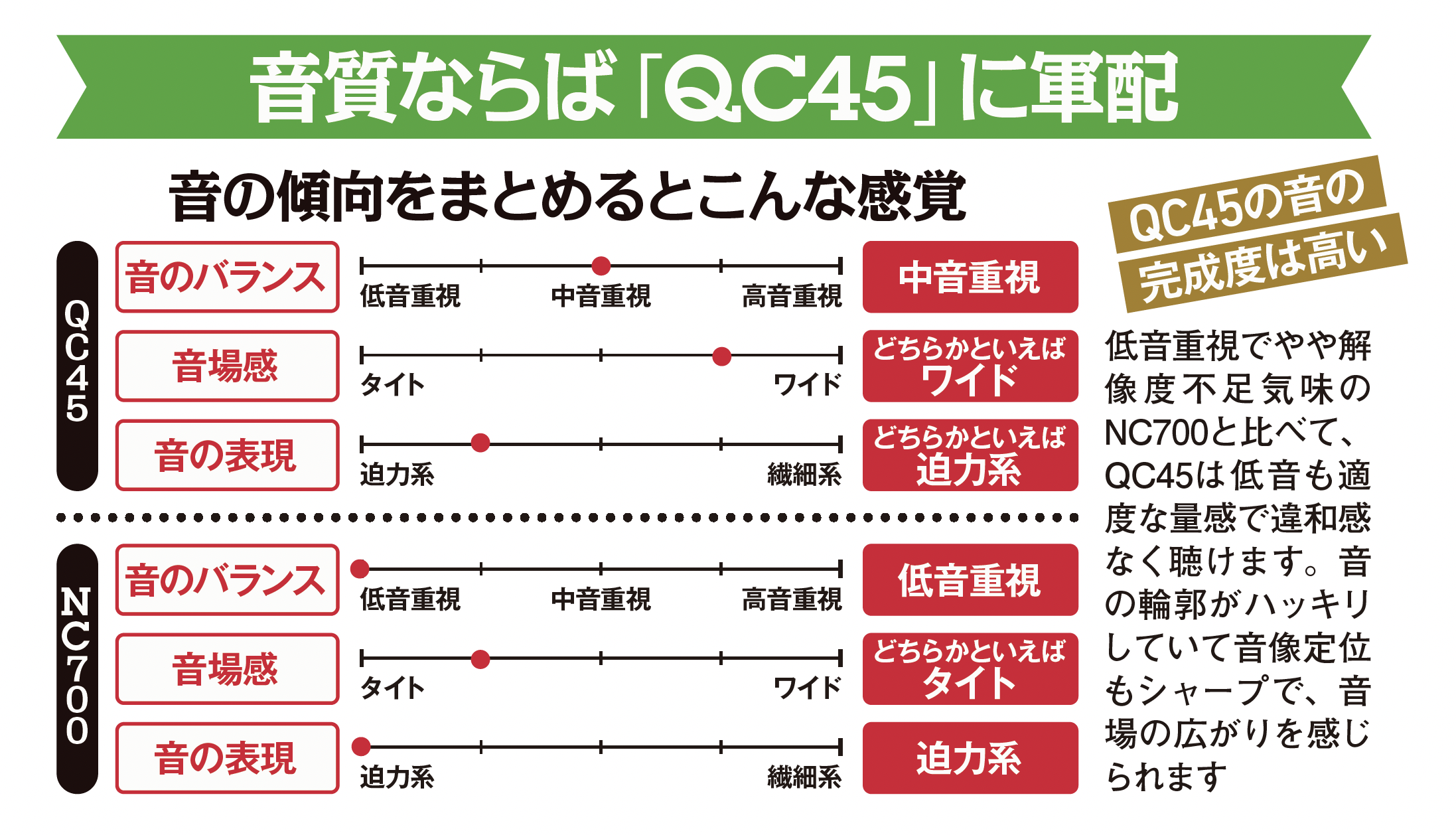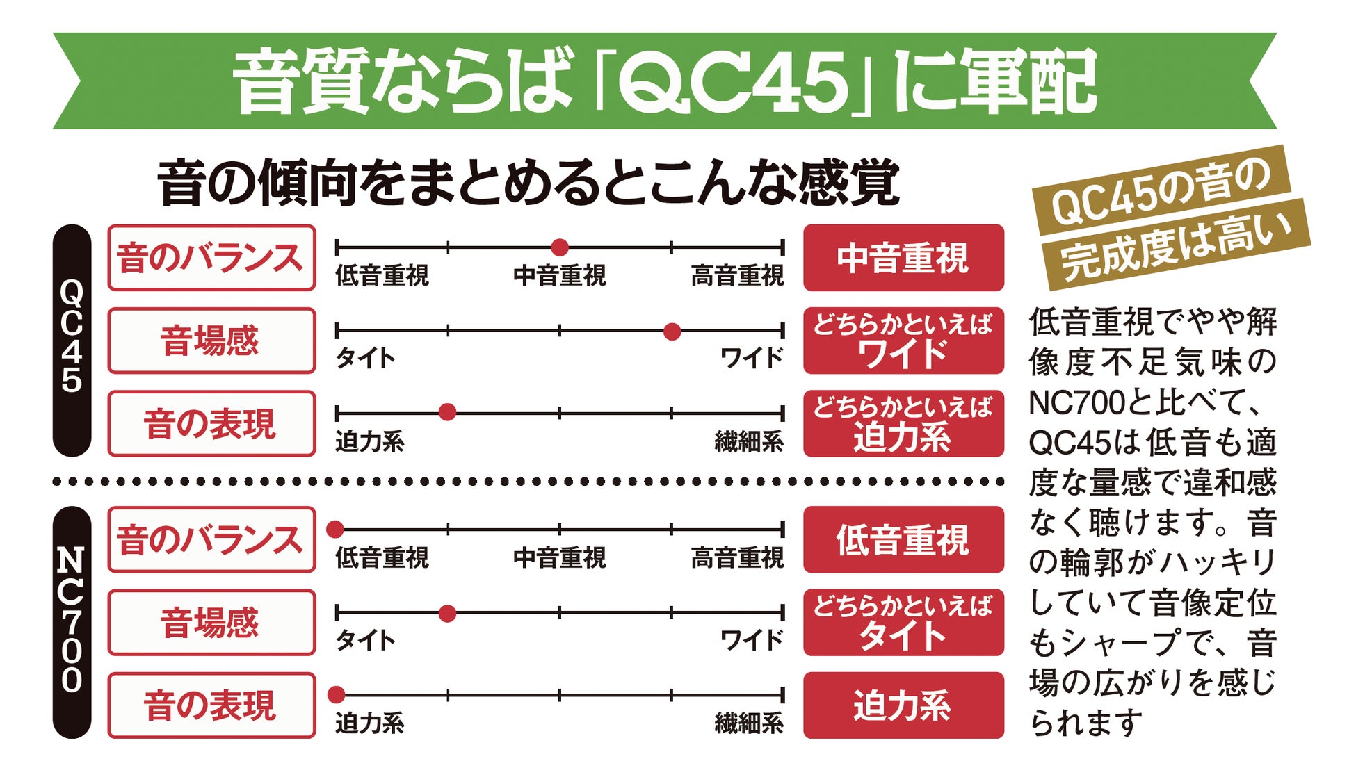 BOSEのノイキャンヘッドホン「NC700」の直接の後継機ではありませんが、昨年新モデルが登場したのが人気の「QC45」。2製品を聴き比べてみたところ、音質は明らかにQC45のほうが上です。NC700は以前のBOSEを彷彿とさせる量感過多とも思えるほどの低音重視で、ボーカルがザラザラしてしまい気味です。これに対し、QC45は歯切れがよく、低域のレスポンスも抜群。低音は適度な量感で解像度も中高域で揃っており、違和感なく聴けます。量感不足も感じません。ボーカルもなめらかで心地よく、音楽のジャンルを問わず楽しめます。ノイキャン性能も優秀で、マイクはNC700より一歩劣るものの十分な性能。音楽や動画、テレワーク、外出時も含めてどんな場面でも使える製品です。