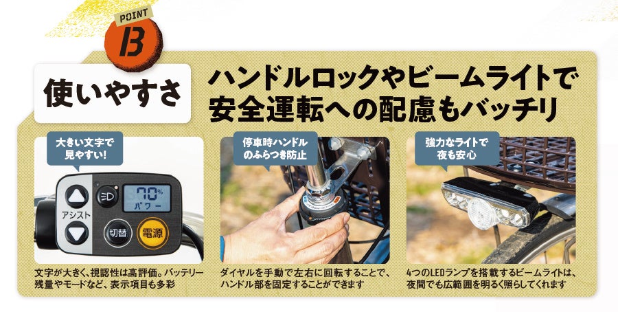 同モデルの特徴は軽量化されたボディ。他のモデルに比べて2kg以上も軽く、スタンドを立てたり、サドルとハンドルを持って移動させるのがラクチン。アシストのパワーは強く、約6kgの重りをのせて坂道を登ってもペダリングが軽やか。大きなカゴや手動のハンドルロックで、荷物が多くなっても安心。広範囲を照らすビームライトで夜間走行をサポートするなど、便利な機能が充実しているのも高評価。通勤通学や買い物の重い荷物に悩んでいる人には、ぜひ使ってほしい一台です。