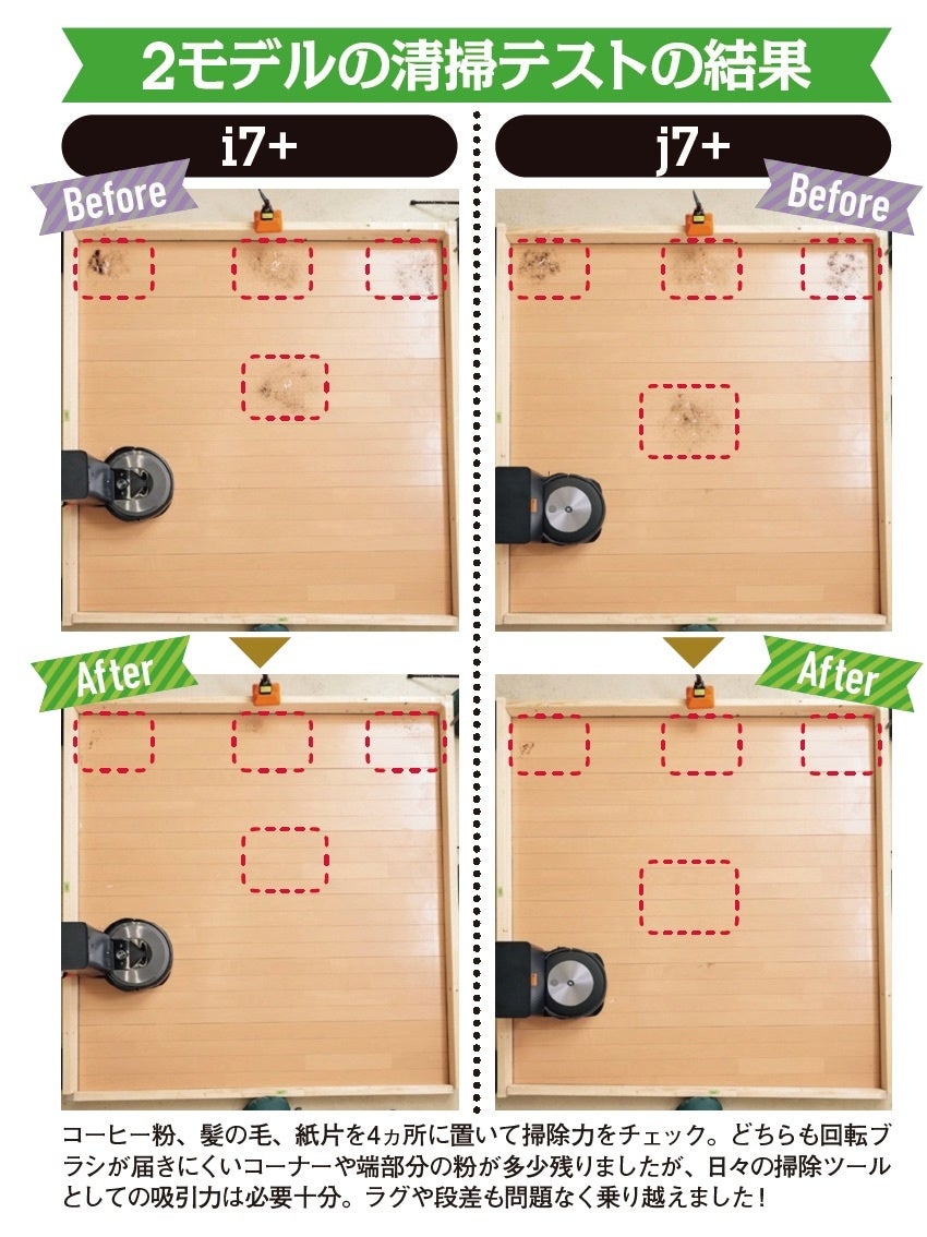 「ルンバ史上最高の賢さ」を謳うモデルj7+が新発売。新採用の『PrecisionVision ナビゲーション』による特定の障害物の検知&回避機能が最大のウリです。そこで今回は、過去ベストのi7+と本製品を従来のテスト方法に加え、特定の障害物に対する挙動もテストし、比較してみました。すると掃除力や、基本的な障害物に対する挙動はほぼ同じ。新機種はコード類などをしっかり回避できました。クリーンベースにゴミを吸い上げる音が大きいのは気になりましたが、ロボット掃除機の導入にハードルを感じていた人におすすめの一台です。