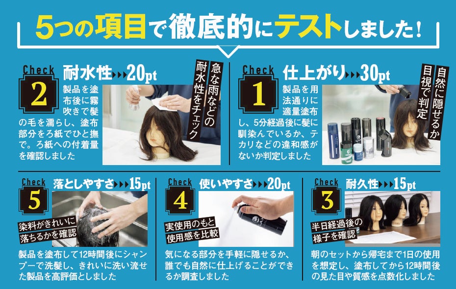 髪や頭皮への馴染みがよく、初心者でムラなくスタイリングできる点で、仕上がり項目で満点を獲得。またヘッドが前傾のため振りかけやすく、繊維もダマにならず自然に定着し使いやすさも優秀です。耐久性項目では、塗布して時間後と塗布直後で見た目の変化はほぼなし。塗布直後と遜色ない優秀な耐久性が実証されました。使用後はシャンプーで洗えばきれいに落とせる点も◎。全体的にハイスペックにまとまった珠玉の1本と言えます。