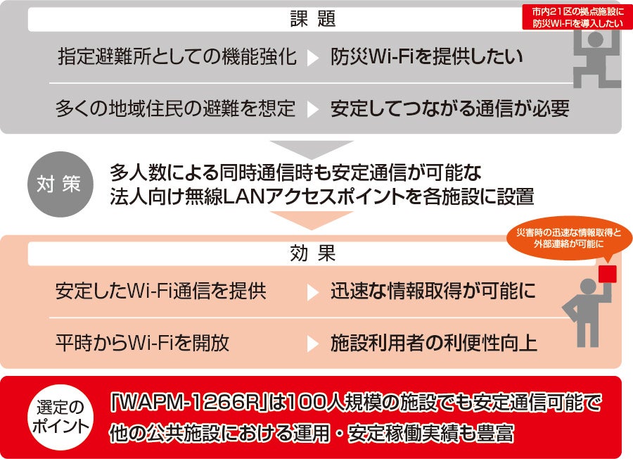 市の防災・減災対策の一環として、市内21区の拠点施設へ防災Wi-Fiを導入。災害時における迅速な情報取得や外部との連絡が可能な通信環境を構築。