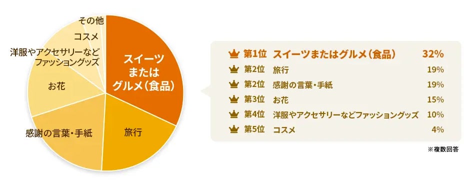 1位がスイーツまたはグルメなどの食品、2位が感謝の言葉・手紙、3位が旅行