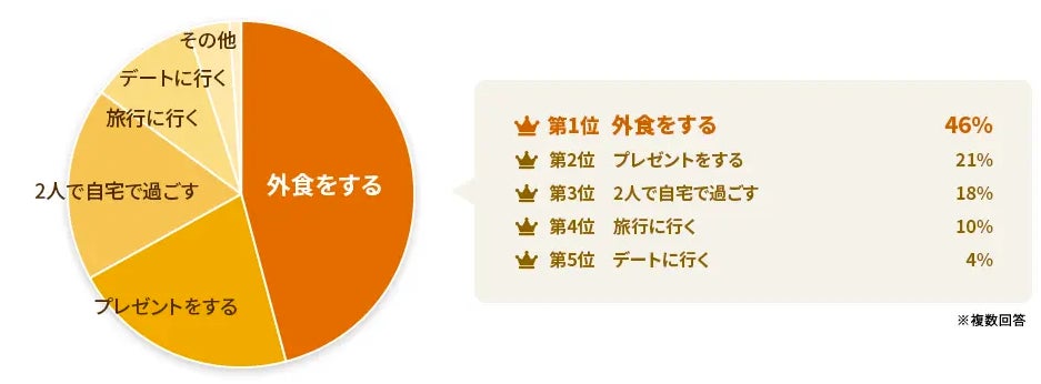 1位が「外食に行く」で46%、2位が「プレゼントをする」で21%、3位は「2人で自宅で過ごす」で18%という結果でした。