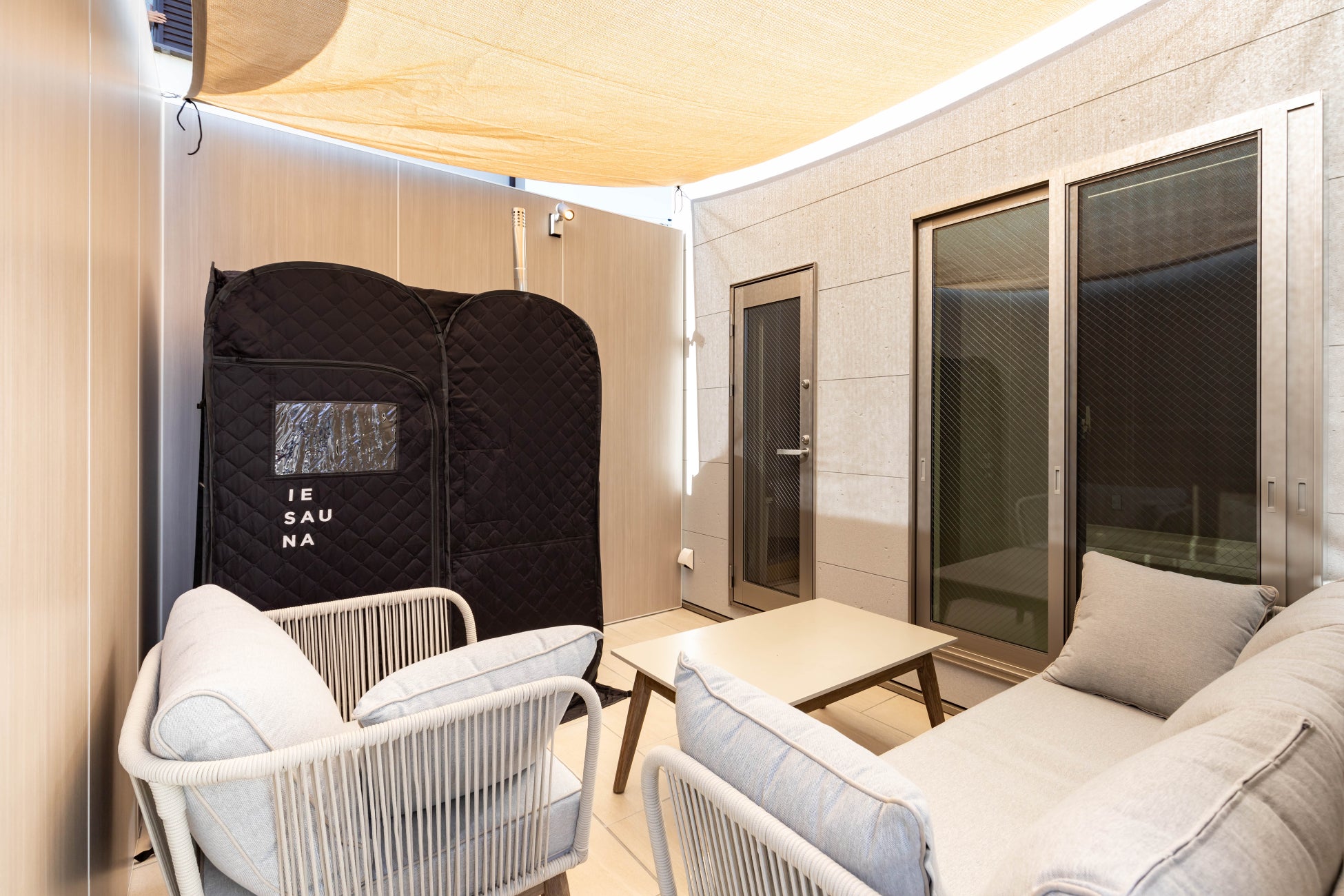最大の特長は、バスルームのテラスドアから「5th ROOMⓇ」に出ることができる、斬新な間取り。バスルームから外にある個人用屋外プライベートサウナに365日入ることができ、毎日リラックスして“ととのう”ことができます。内観デザインもヌックや間接照明を取り入れ、今のトレンドに沿ったデザインとなっております。