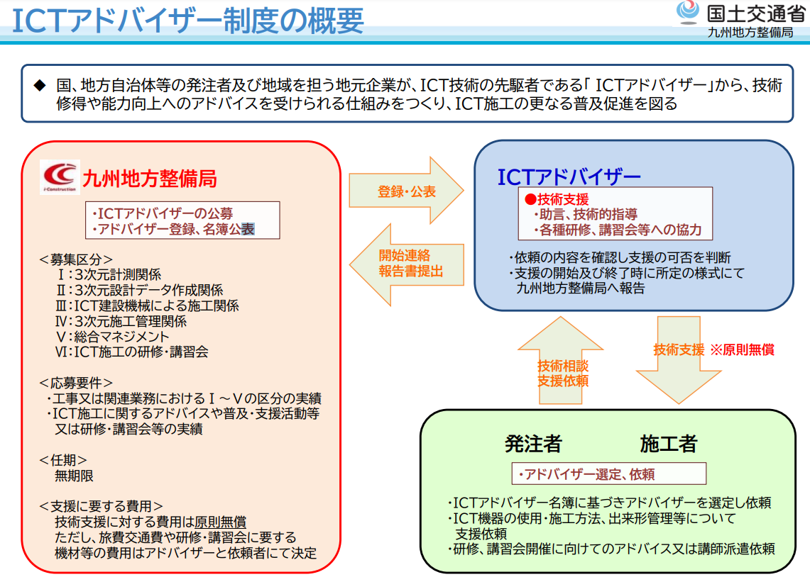 ICTアドバイザー制度の概要について( http://www.qsr.mlit.go.jp/ict/site_files/file/gaiyozu_211130.pdf )より抜粋(国土交通省 九州地方整備局、2021年11月)