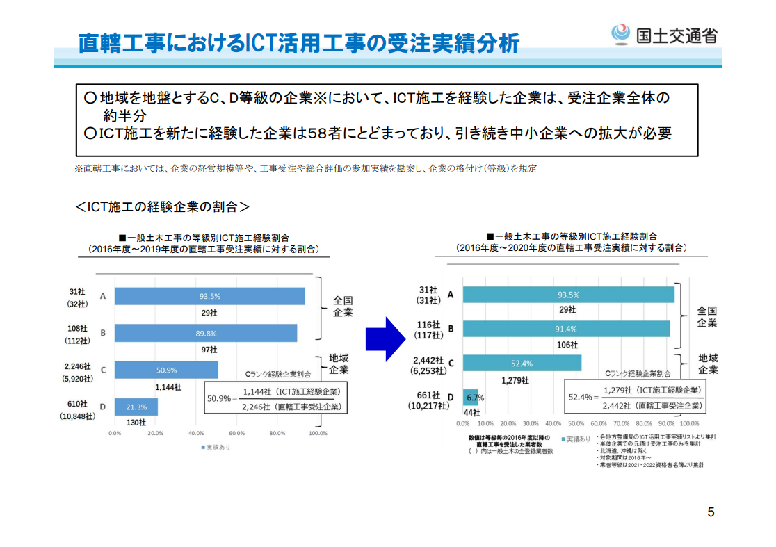 これらの取り組みは令和5年度から、直轄土木業務・工事の全てを対象に原則適応となります。しかし2021年の国土交通省の「ICT施工の普及拡大に向けた取組(https://www.mlit.go.jp/tec/constplan/content/001493469.pdf)」によると、地域を地盤とするC、D等級の企業※においてICT施工を経験した企業は、受注企業全体の約半分であり、地方を中心にICT施工が普及していないことが分かります。