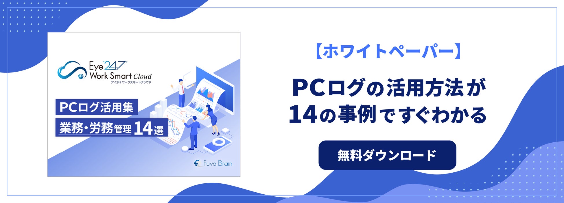 PCログ管理ツール「Eye“247” Work Smart Cloud」を活用した業務・労務管理方法をホワイトペーパーにまとめました。業務可視化はもちろん、生産性向上や働き方改革にもご活用いただけます。