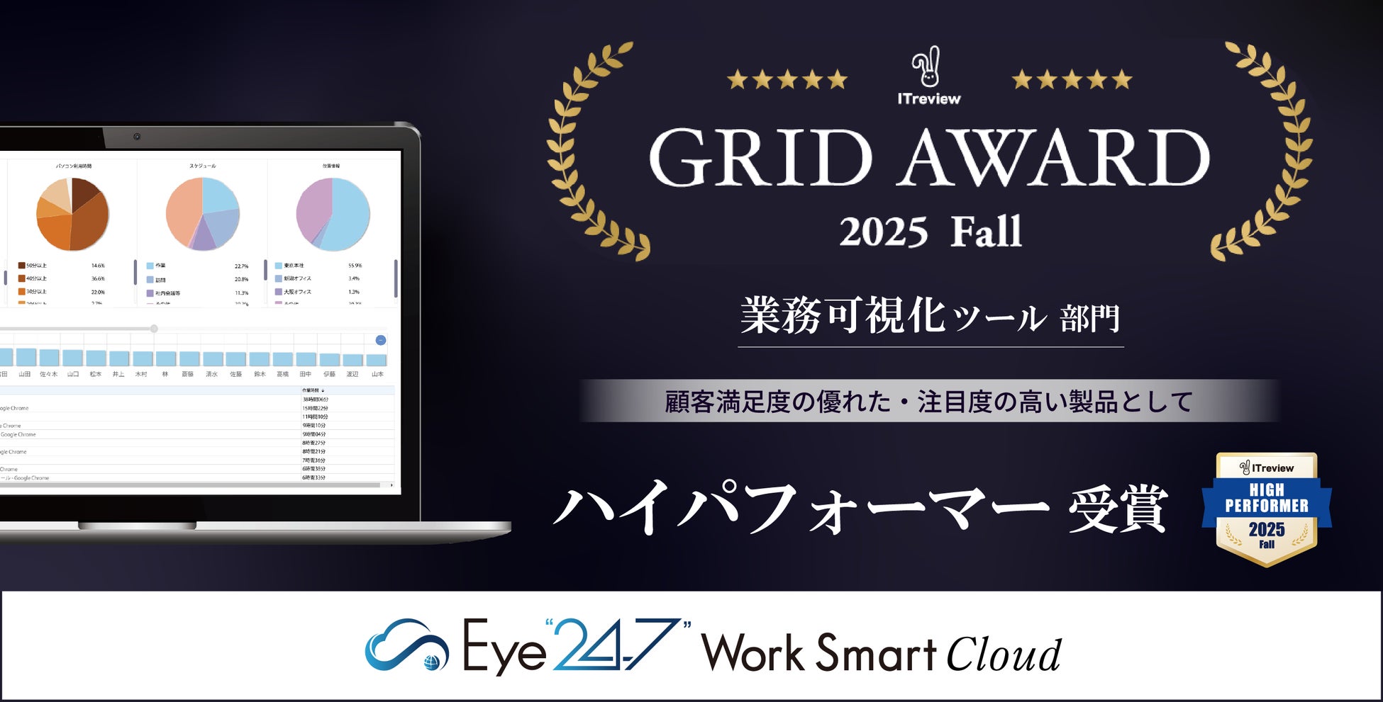 サイバーセキュリティカンパニーの株式会社フーバーブレイン(本社:東京都千代田区、代表取締役社長:輿水 英行、東証グロース3927、以下、当社)が提供する、PCログ管理ツール「Eye“247” Work Smart Cloud(アイ247ワークスマートクラウド)」が、アイティクラウド株式会社主催の「ITreview Grid Award 2025 Fall」において、「業務可視化ツール部門」で高満足度の称号である「High Performer」を受賞したことお知らせします。