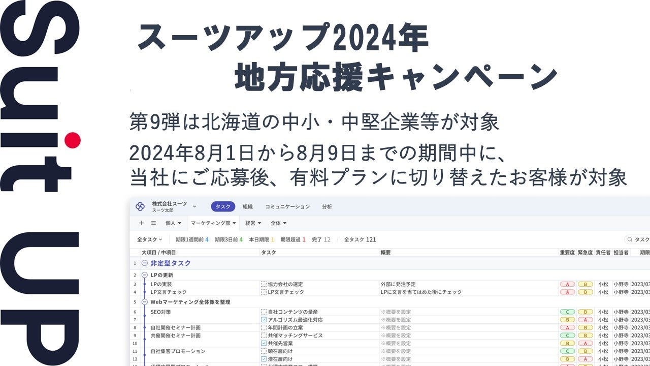 株式会社スーツ(所在地:東京都千代田区、代表取締役社長CEO:小松 裕介)は、「スーツアップ2024年地方応援キャンペーン」第9弾として、北海道の社員数100名未満の中小・中堅企業、スタートアップを対象に割引キャンペーンを実施いたします。