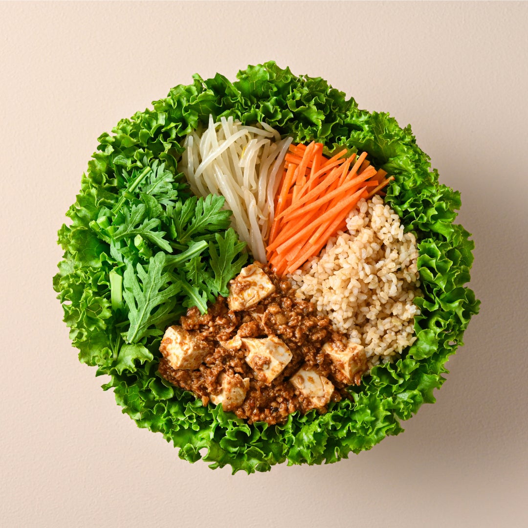 四川⾵⿇婆⾖腐と、もやしナムルや⽞⽶の⾷感がマッチ。⾹り豊かな春菊がほどよいアクセントとなり、最後まで飽きずに楽しめる、満⾜感たっぷりの⼀⽫です。