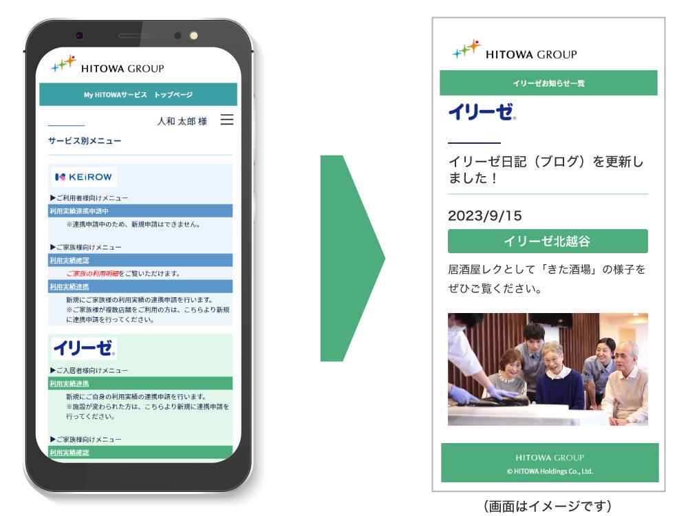 2. 「イリーゼ」のご入居者様およびご家族様には、施設情報等をWEB上でご確認いただけます。また、今後は、施設内でKEiROWをご利用の際には、施術内容の詳細を「My HITOWAサービス」内でご確認いただけるとともに、施設ごとのお食事の献立やイベント情報なども閲覧できるようになる予定です。(※1)