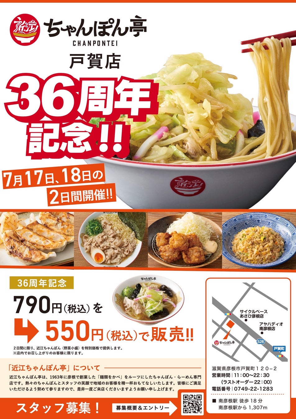 【近江ちゃんぽん亭】「 祝!近江ちゃんぽん亭戸賀店36周年の感謝を込めて」