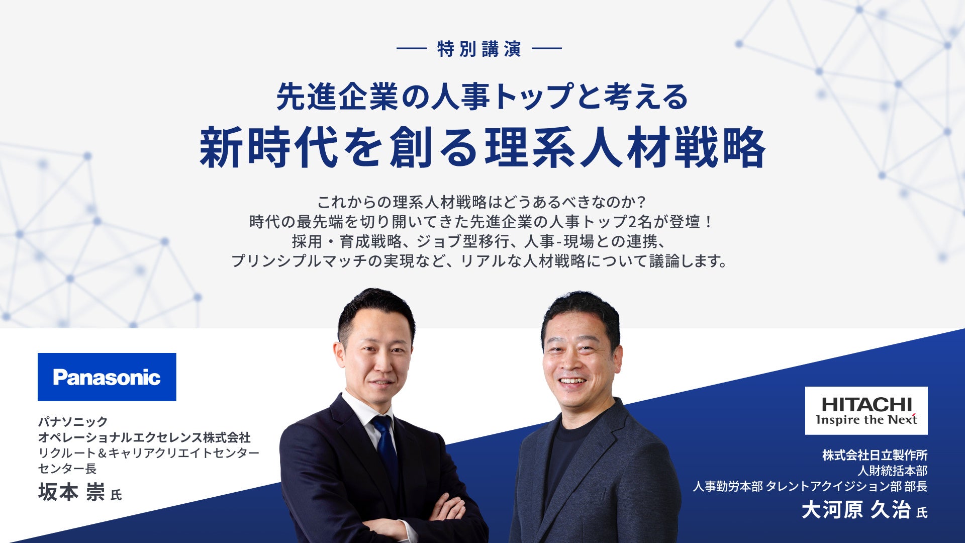 これからの理系人材戦略はどうあるべきなのか?時代の最先端を切り開いてきた先進企業の人事トップ2名が登壇!採用・育成戦略、ジョブ型移行、人事-現場との連携、プリンシプルマッチの実現など、リアルな人材戦略について議論します。
