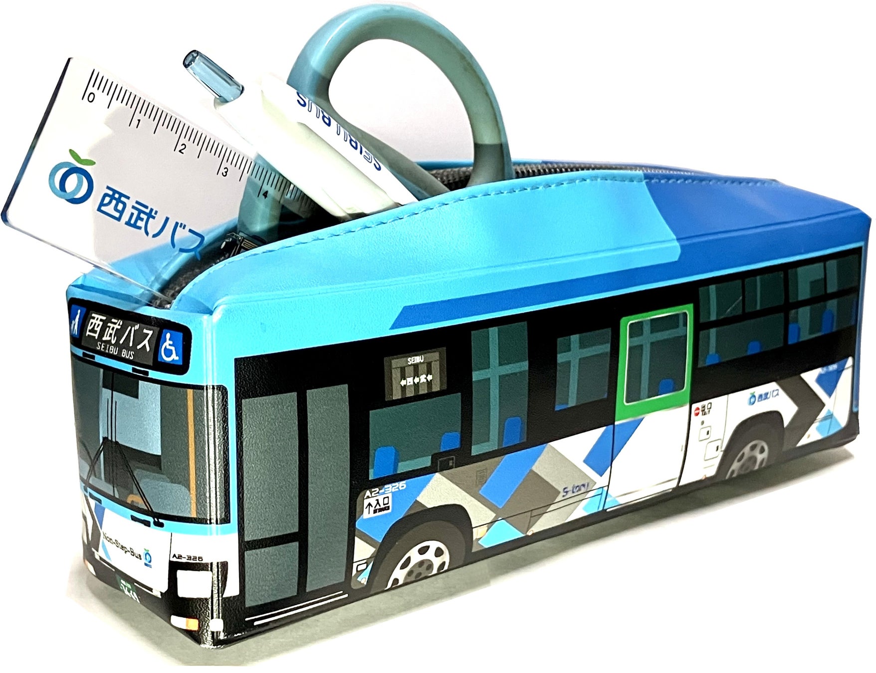 西武バスのニューデザインS-tory(いすゞエルガ)デザインのバス型ペンケースです。ハサミや定規なども入る大容量なので、バス好きなお子さまへのプレゼントにもおすすめです。