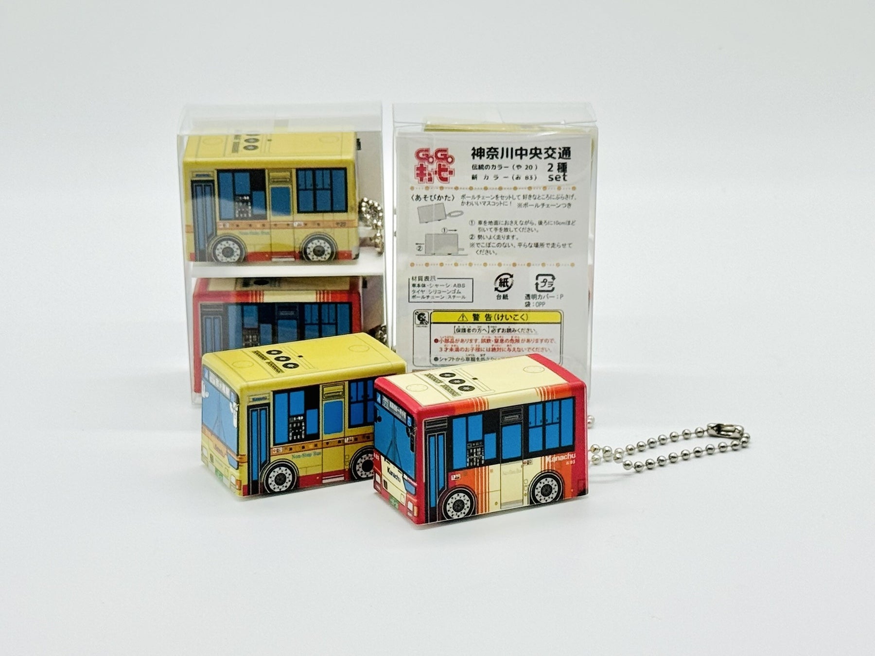 伝統のカラー「や20号車」と新カラー「お83号車」のセット。神奈川中央交通のバスがプルバックでコトコト走行する話題の「GoGoキュービー」になりました。ボールチェーン付で、かわいいマスコットとして一緒におでかけできます。
