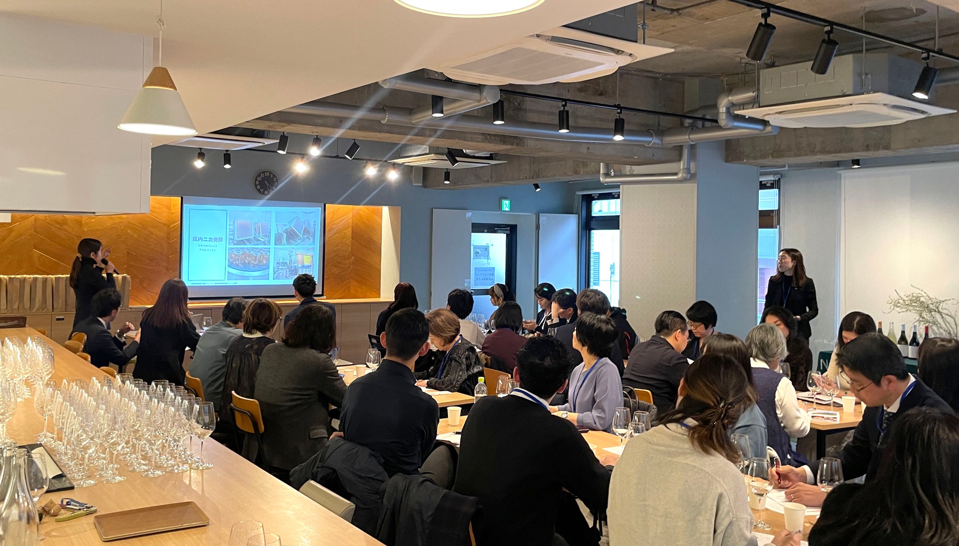 栽培技師長の倉岡より、ブドウ栽培のこだわりについて、土地の土壌に適した栽培方法や、高品質のブドウを育てるための管理方法をお話ししました。また、醸造責任者の太田からは当日提供した最新ビンテージワインそれぞれのコンセプトやアロマ(香り)、ロゼの色合いに関するこだわりなどをお話しし、試飲をしながら解説を行いました。