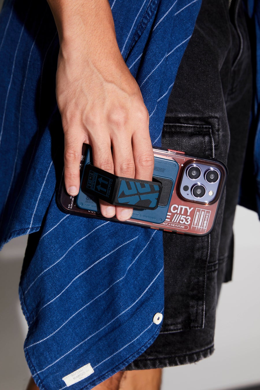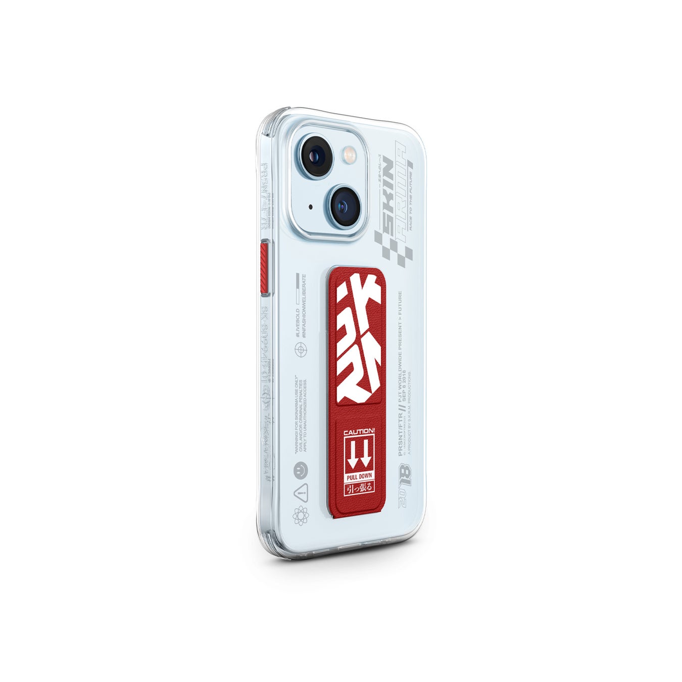 太字のタイポグラフィ、スタイリッシュな磁気リングモジュール、交換可能なストラップループを備え、デザインと機能が一体となったクリアケースです。
