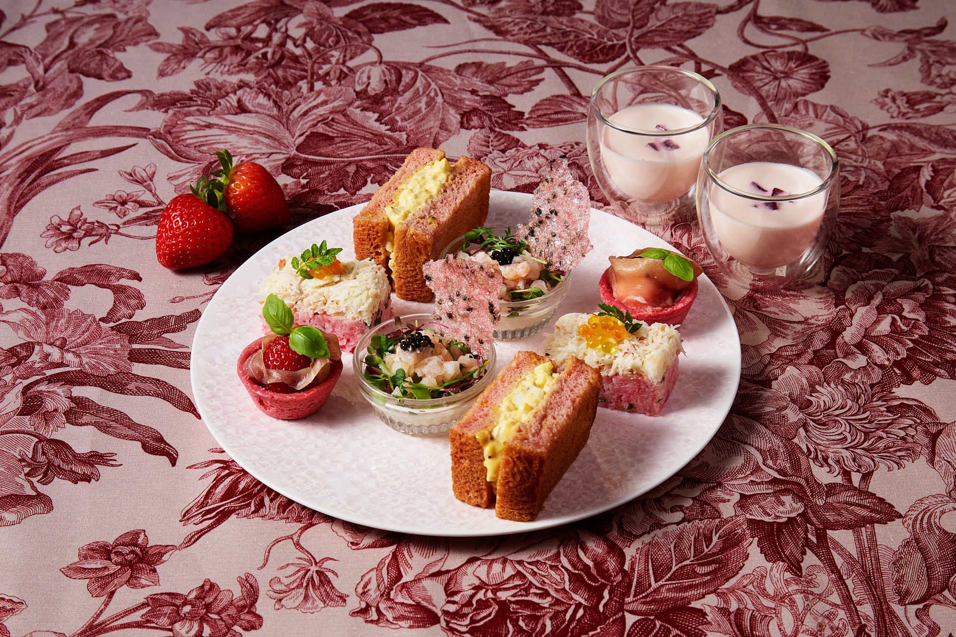 セイボリーにもいちご、ピンクをテーマに、季節の食材を使用した華やかなアイテムが並びます。最初にサーブされるのは、寒さが厳しくなる冬においしさが増すカリフラワーを使った「カリフラワーとビーツのスープ」。まろやかなカリフラワースープをベースに、ビーツの自然な甘みを加えることで、やさしい味わいと美しいピンク色に仕上げました。毎年ご好評をいただいている「ベリーローフとトリュフ卵サンドウィッチ」が今年も登場します。軽くトーストしたベリーローフに、芳醇な香りのトリュフを贅沢に加えた卵サンドは、素材の魅力を引き立てる上品な味わいです。旬を迎えて身が引き締まり、甘みが増す甘エビを使った「甘エビのタルタル かぶムース キャビア」は、かぶのムースに甘エビのタルタルを重ね、キャビアを添えることで、味わいに奥行きを持たせた一品です。いちご柄のチュイルも添えて、食感の変化も楽しめます。「いちごとモッツアレラと生ハム 25年バルサミコとビーツタルト」は、ピンクのビーツタルトに25年熟成バルサミコ酢を流し、生ハムを巻いたいちごとモッツァレラを入れています。貴重な25年熟成バルサミコ酢が、味のアクセントとして深みを加えています。「ズワイガニの押し寿司 わさびキャビアとトラウトキャビア」は、ビーツでピンク色に染めた寿司に、旬のズワイガニを乗せた一品です。オリジナルで作ったわさび香るキャビアとトラウトキャビアを添えており、一口ほおばるとわさびの香りがふわりと広がります。