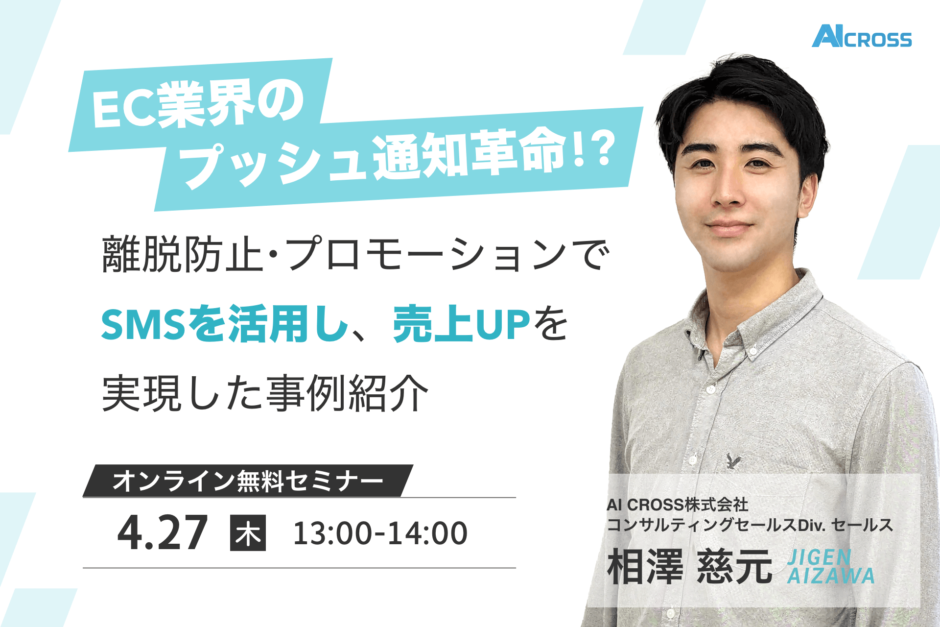 AI CROSS株式会社(本社:東京都港区、代表取締役CEO:原田典子、以下「AI CROSS」)は、当社主催の無料オンラインセミナー「【EC業界のプッシュ通知革命!?】~離脱防止・プロモーションでSMSを活用し売上UPを実現した事例紹介~」を2023年4月27日(木)に開催します。