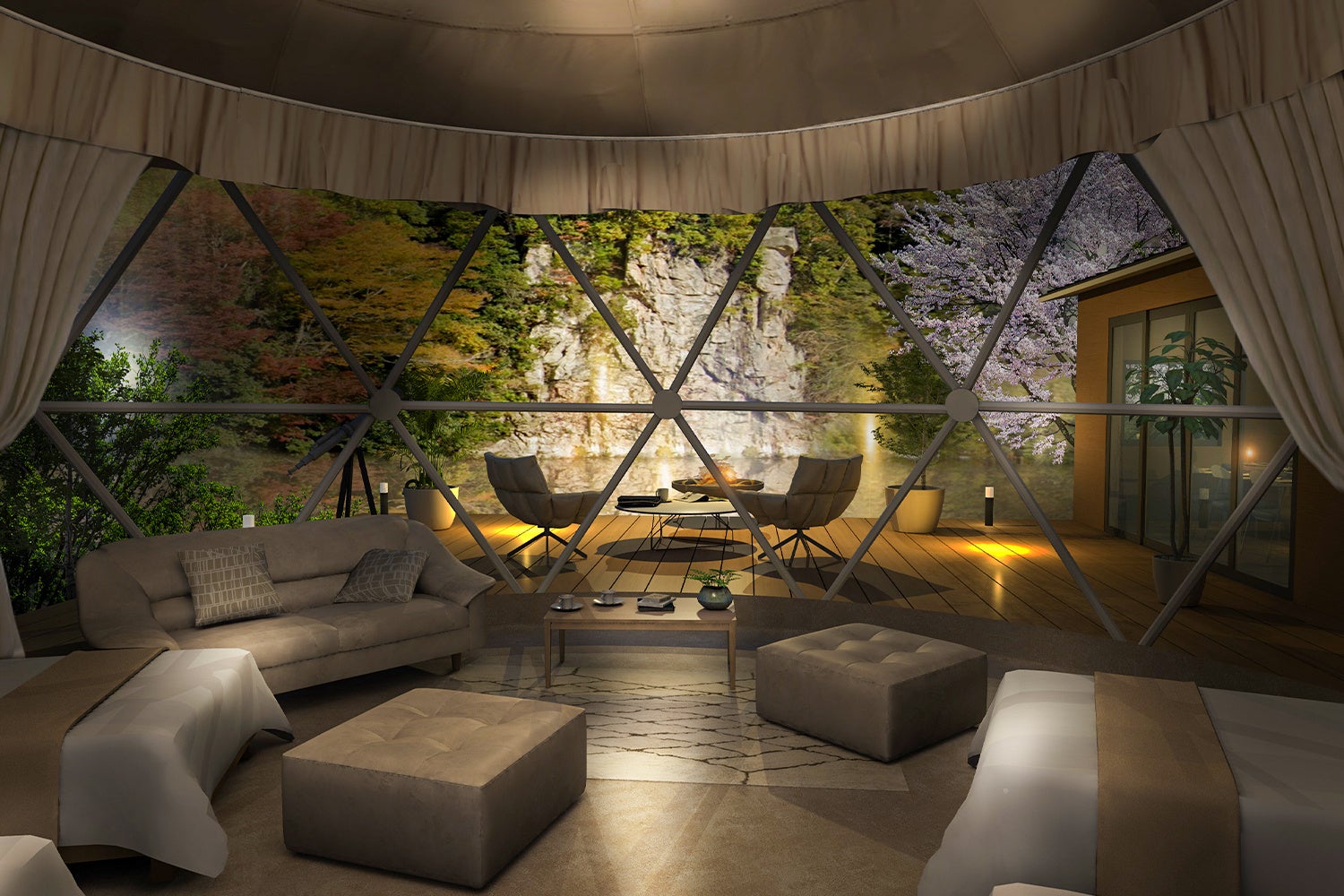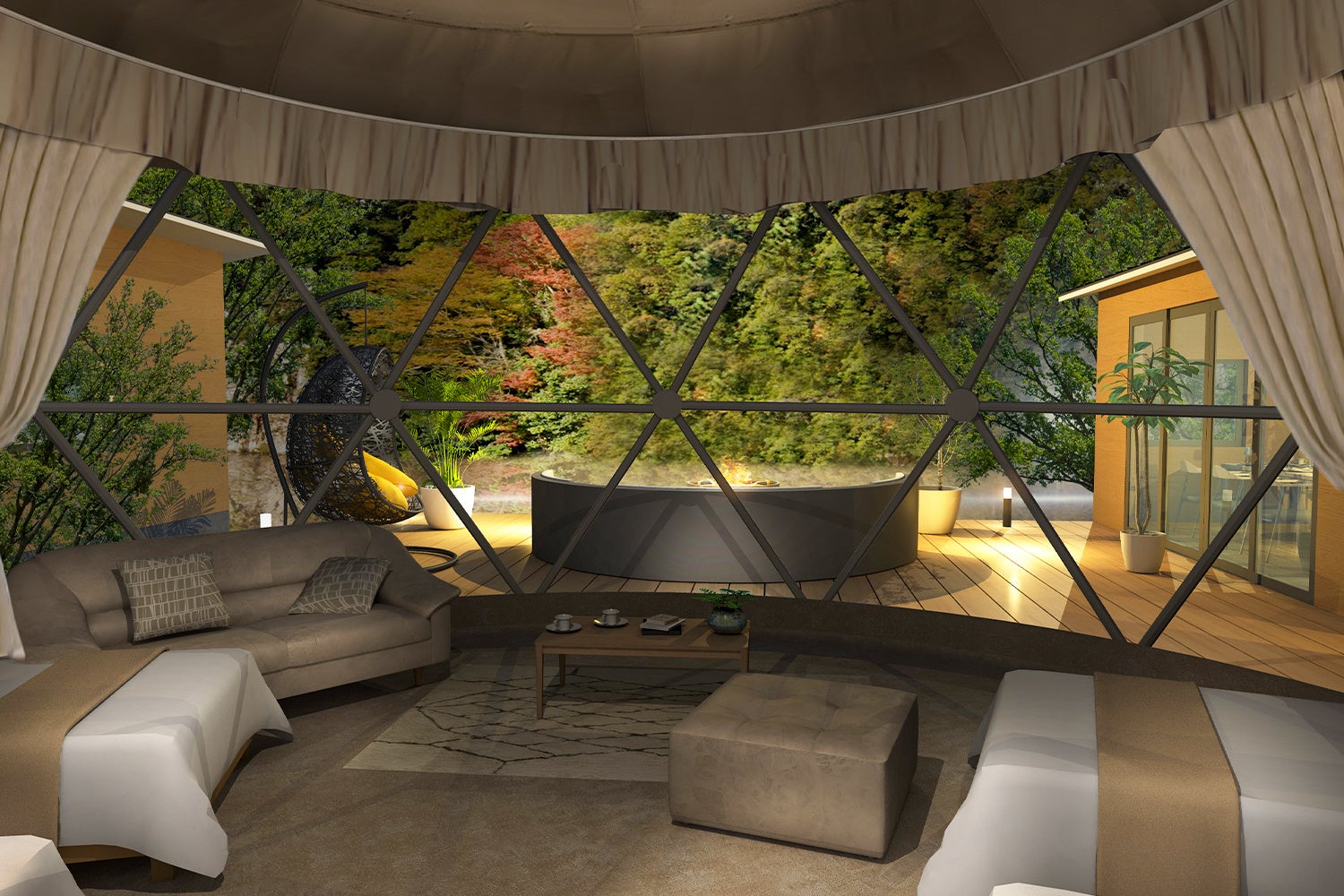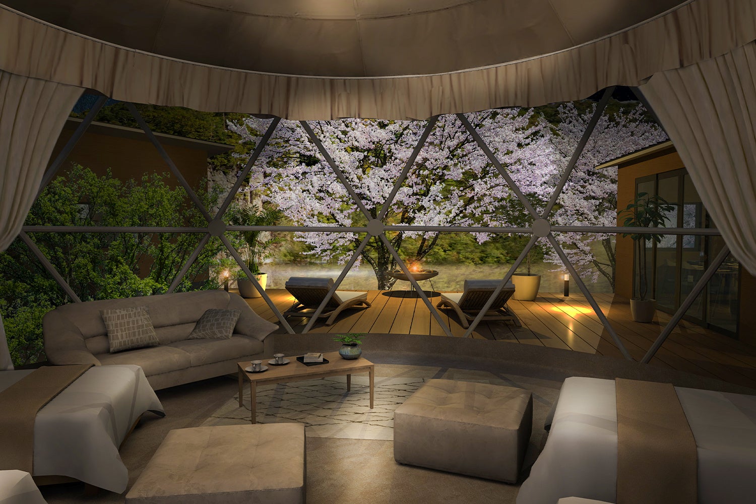 猪名川沿いの景勝地・屏風岩をのぞむスポットに新たなグランピング施設がオープン。