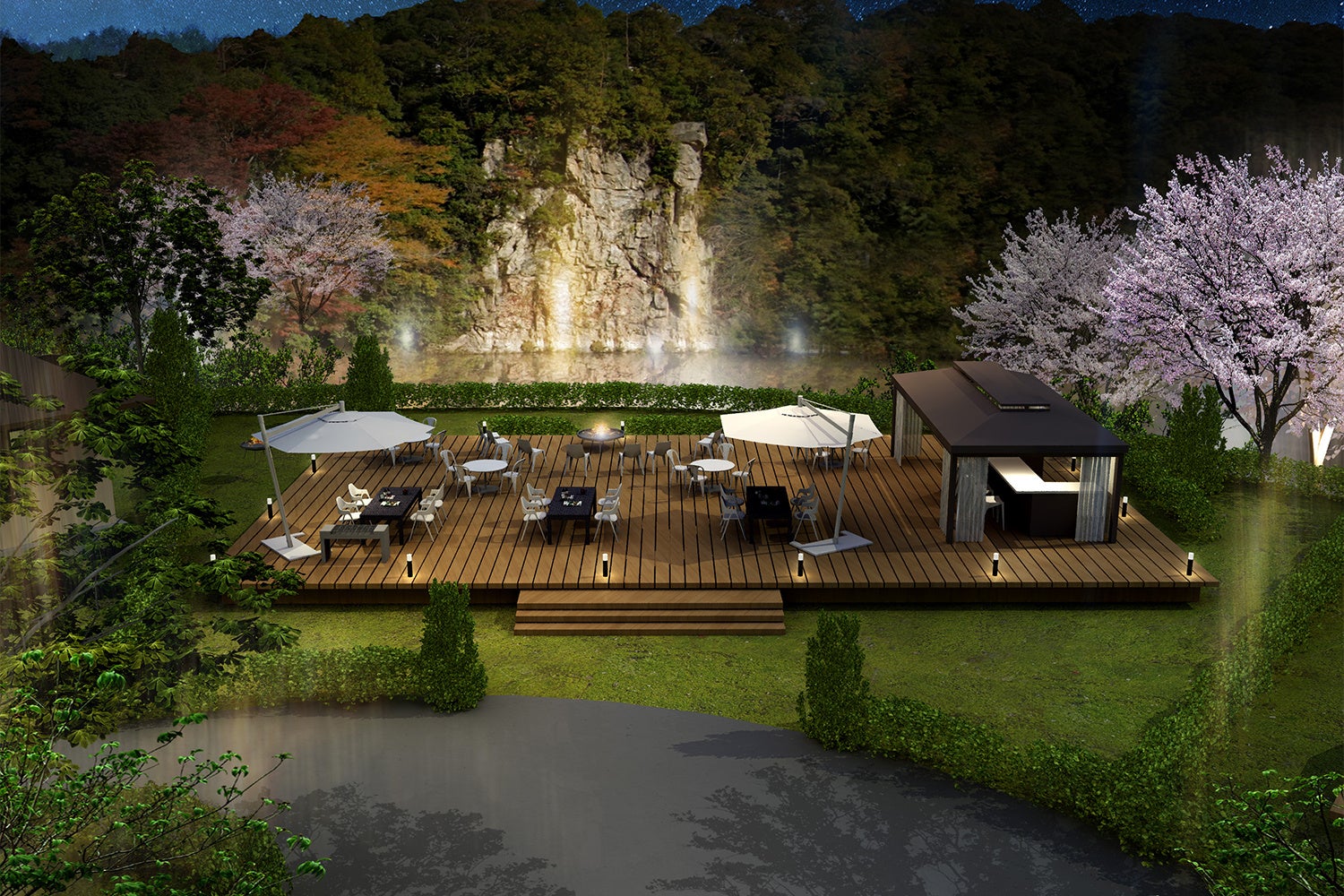 パブリックスペースには、屏風岩の風景美をのぞむ広々としたウッドデッキをご用意。